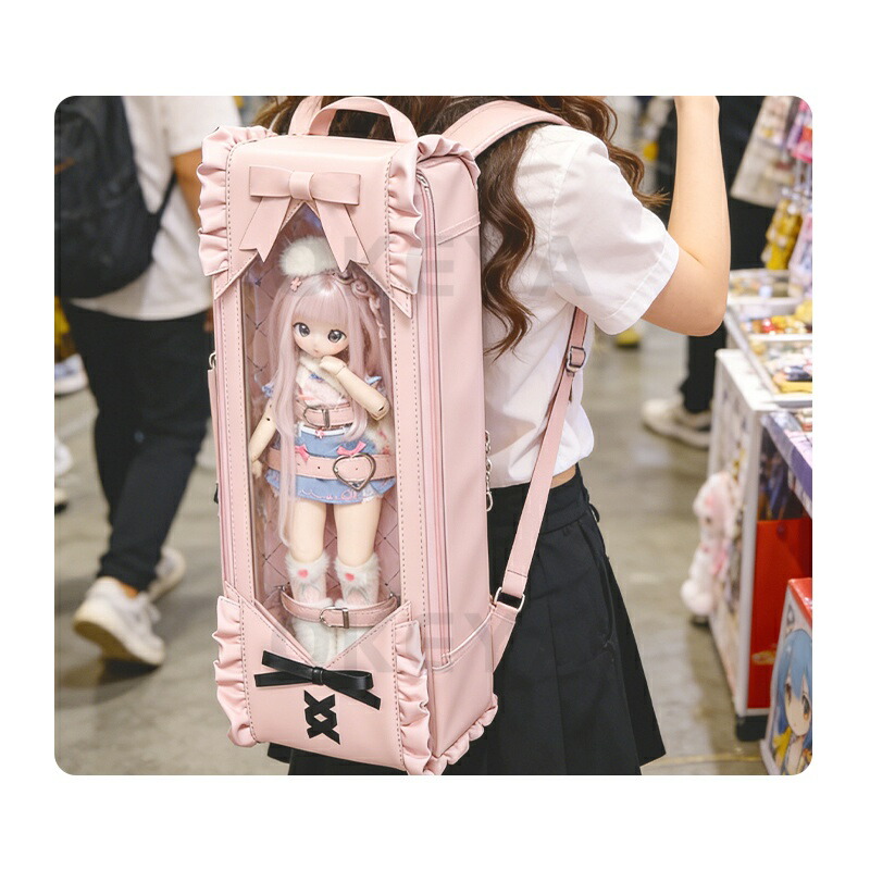 ※バッグ本体が長く、透明窓部分は柔らかいPVC素材を使用しているため、圧力がかかるとドールのメイク部分に触れる場合がございます。気になる方はドールにフェイスカバーなどを着用させてご使用ください。