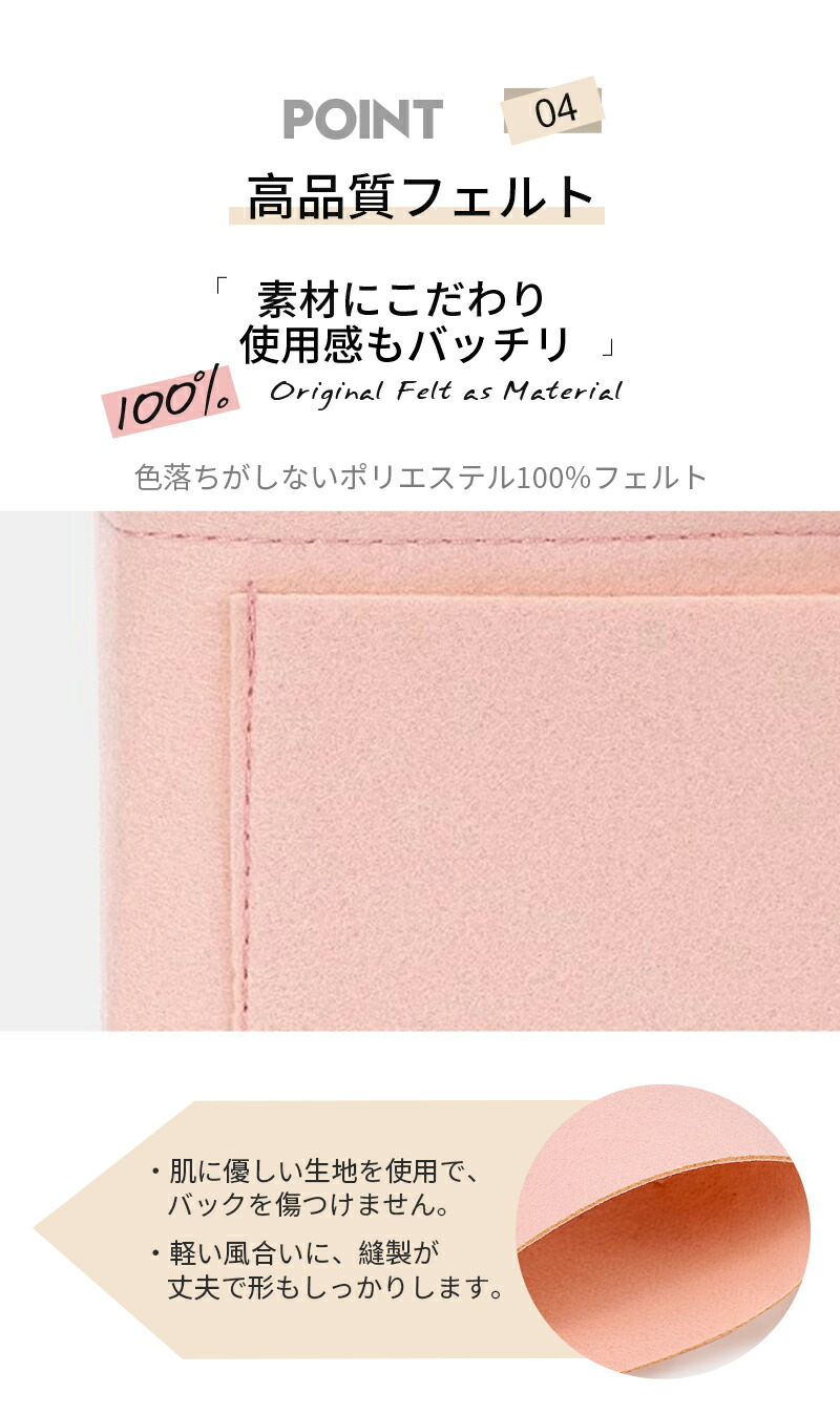 100%オリジナルポリエステルフェルトを使用し、色落ちせず、丈夫で傷つきにくい。軽量で肌に優しく、バッグの中身も守ります。