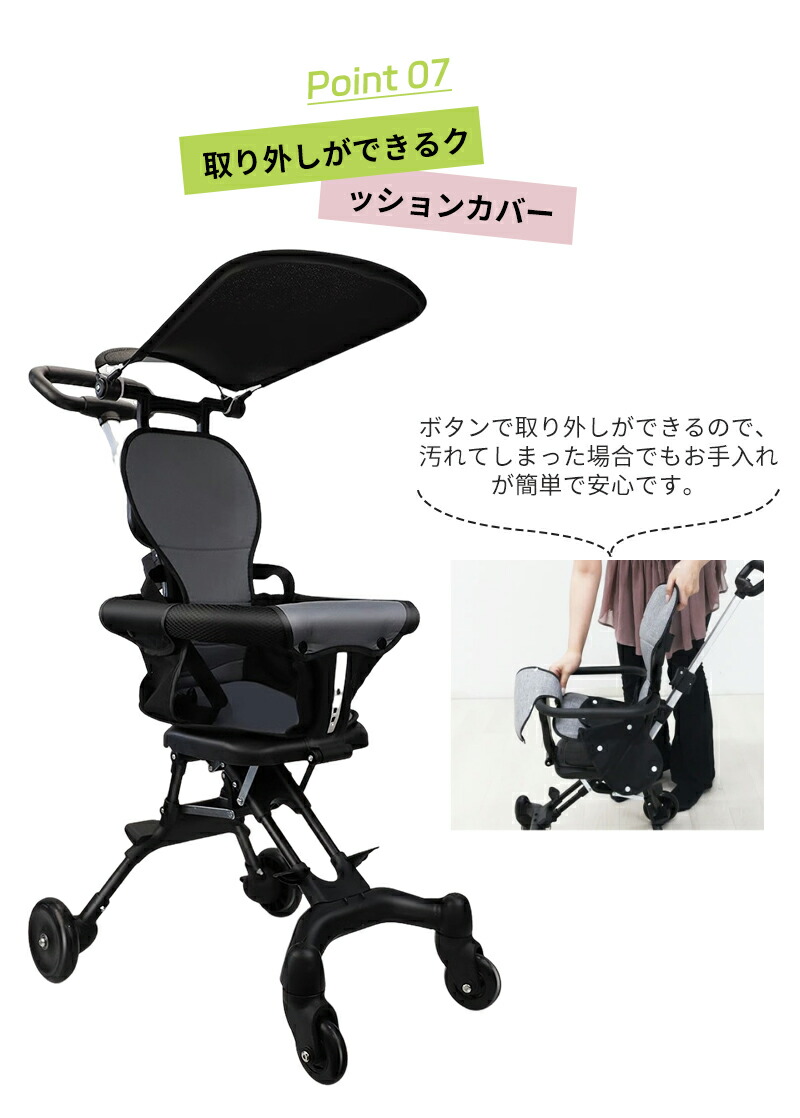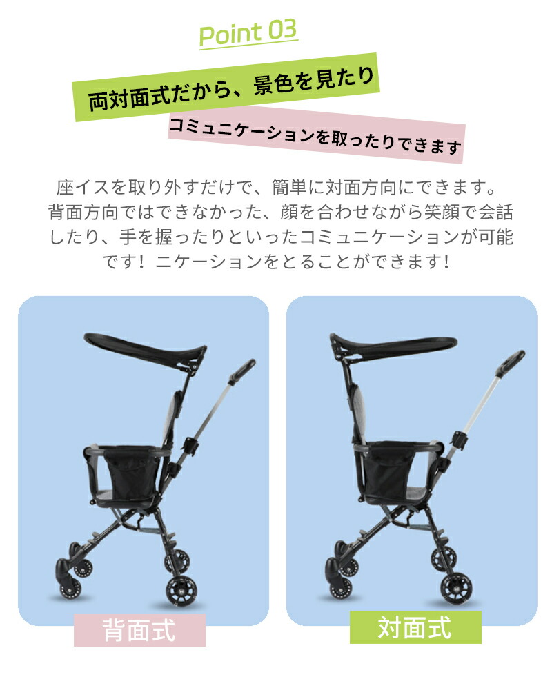 【両対面式】座イスを取り外すだけで、簡単に対面方向にできます。顔を合わせながら笑顔で会話したり、手を繋いだりなどコミュニケーションをとることができます!
