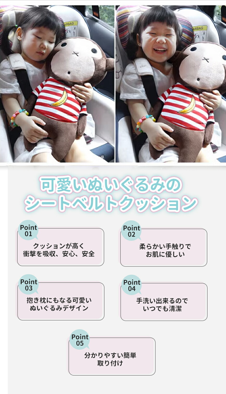 かわいいぬいぐるみキャラクターが付いたデザインで、子供たちが喜ぶこと間違いなし。お子様の車内での退屈を解消し、楽しいドライブ時間を演出します。