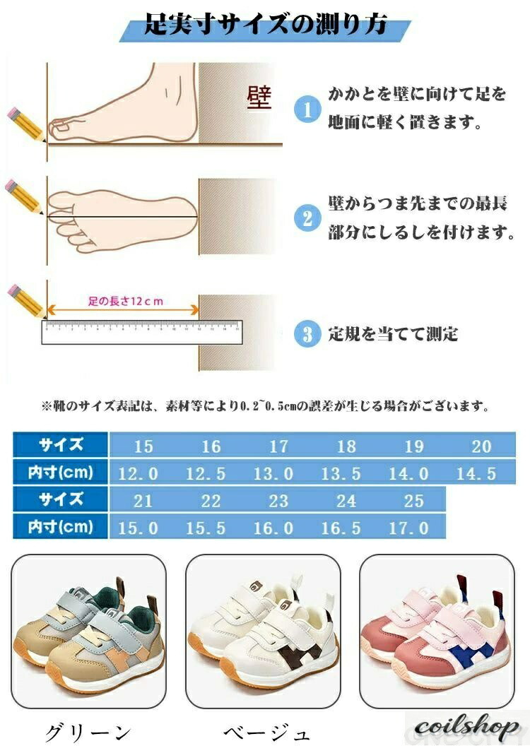 ベビー スニーカー 運動靴 ベビーシュ グリーン ベージュ ピンク 15(内寸12.0cm) 16(内寸12.5cm) 17(内寸13.0cm) 18(内寸13.5cm) 19(内寸14.0cm) 20(内寸14.5cm) 21(内寸15.0cm) 22(内寸15.5cm) 23(内寸16.0cm) 24(内寸16.5cm) 25(内寸17.0cm)