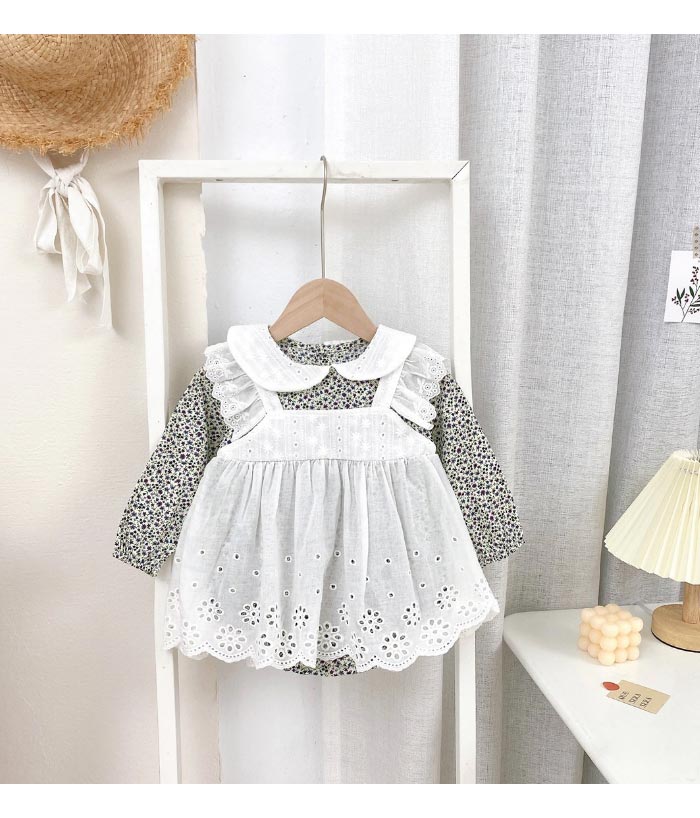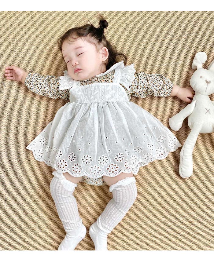 女の子 可愛い ロンパースドレス 秋冬 ロンパースワンピース レイヤードワンピース 花柄 ベビー服 外出 写真撮 綿100%