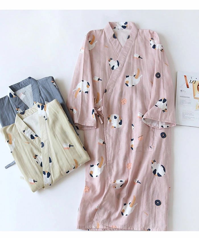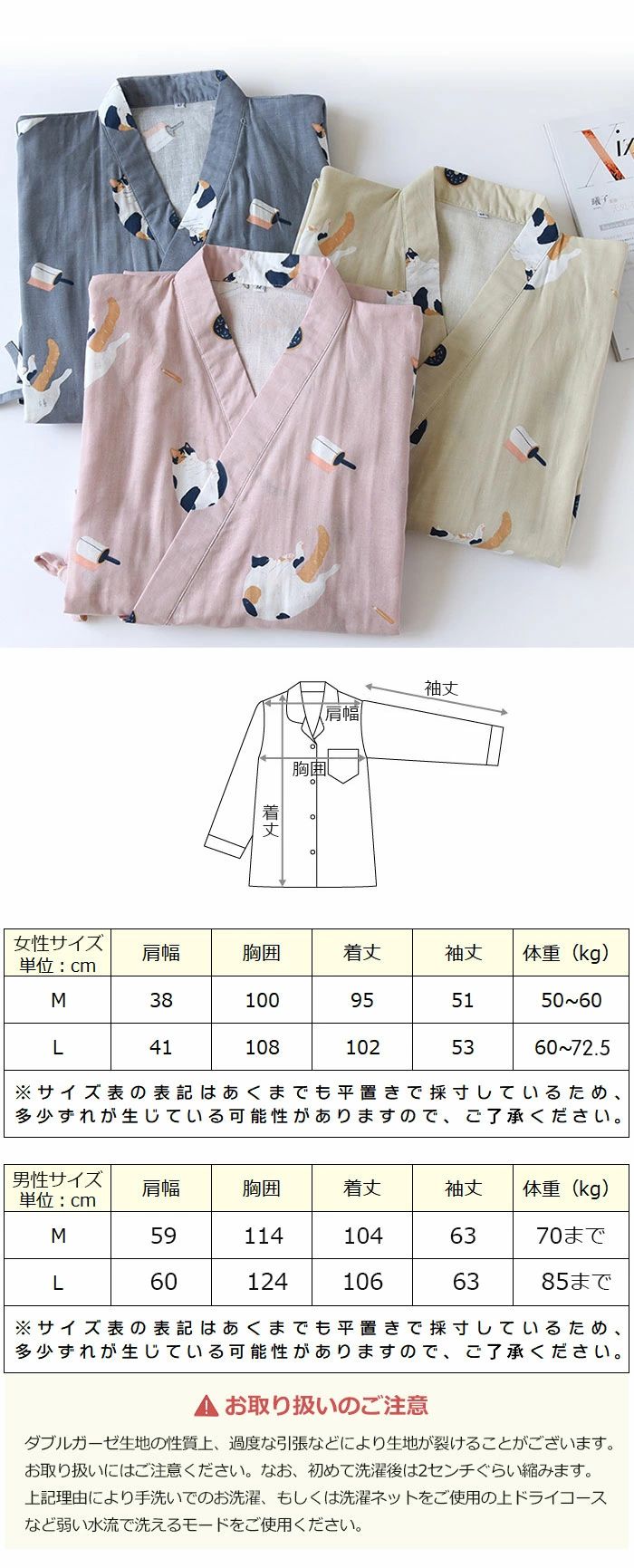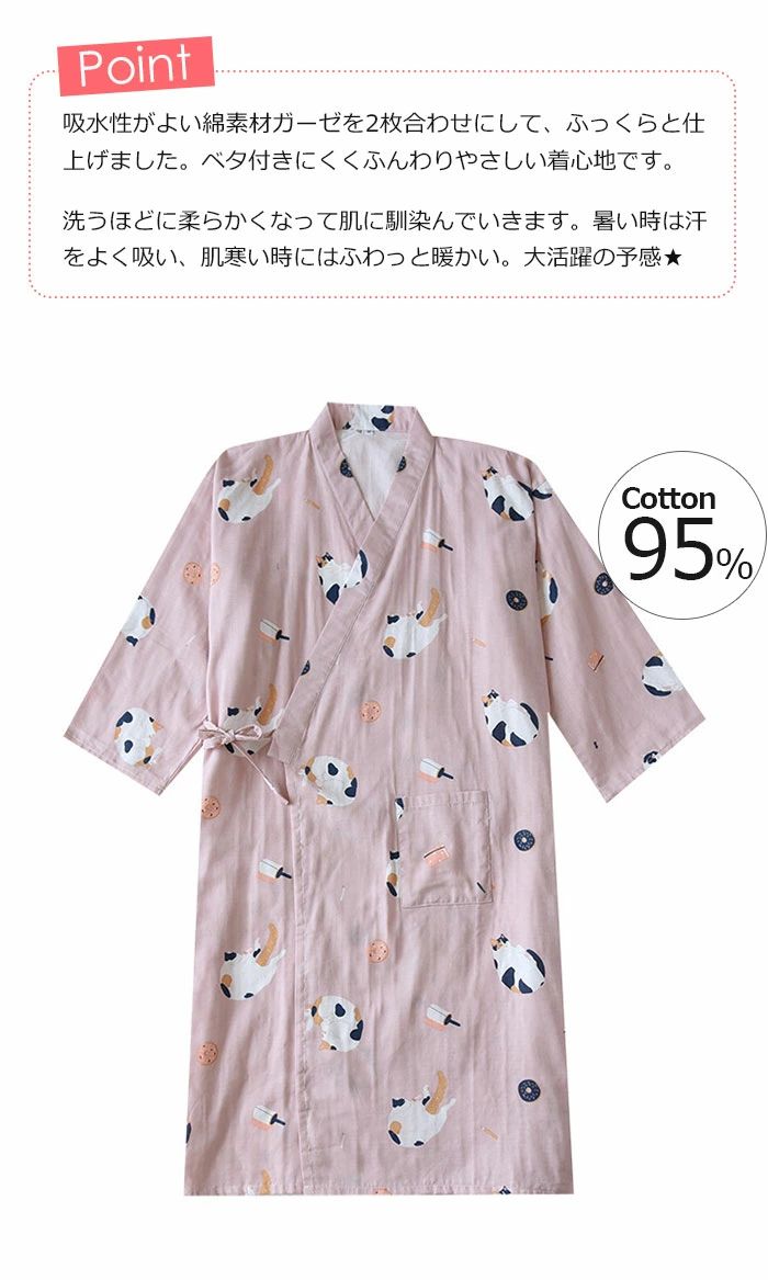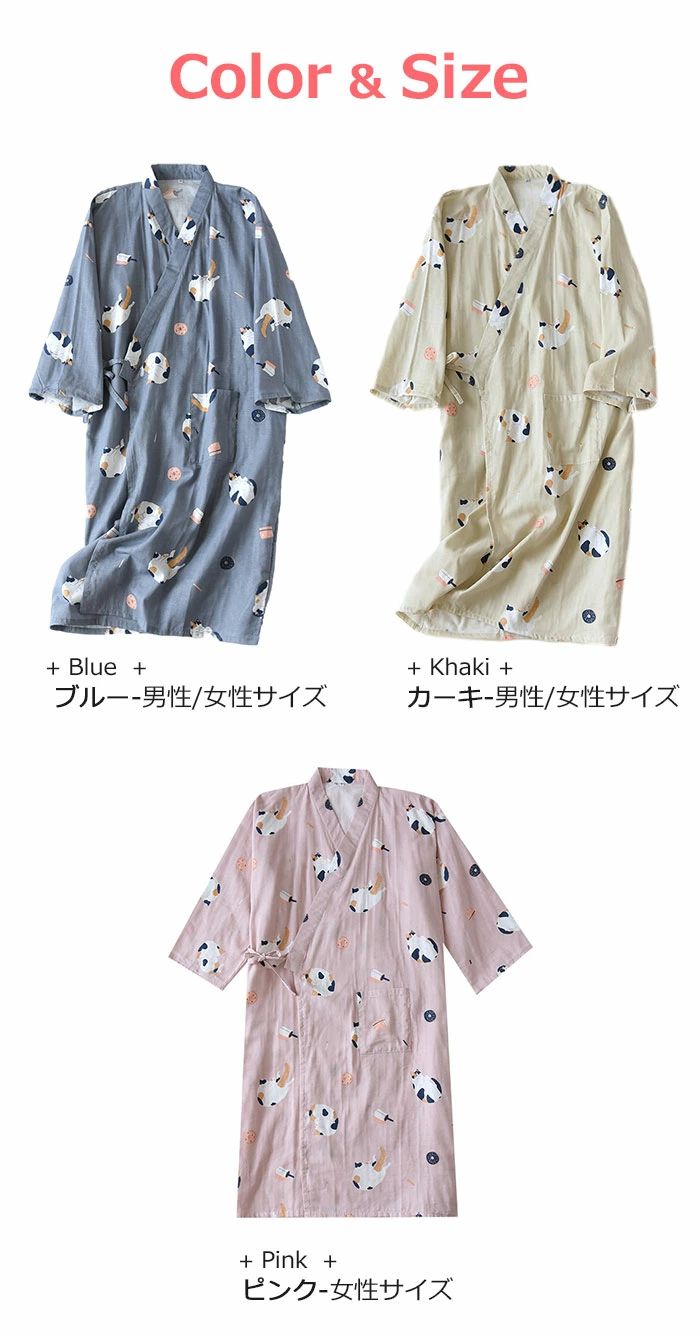 パジャマ 夏 浴衣 寝巻き ガーゼ 綿 ピンク女 ブルー女 カーキ女 ブルー男 カーキ男 M L