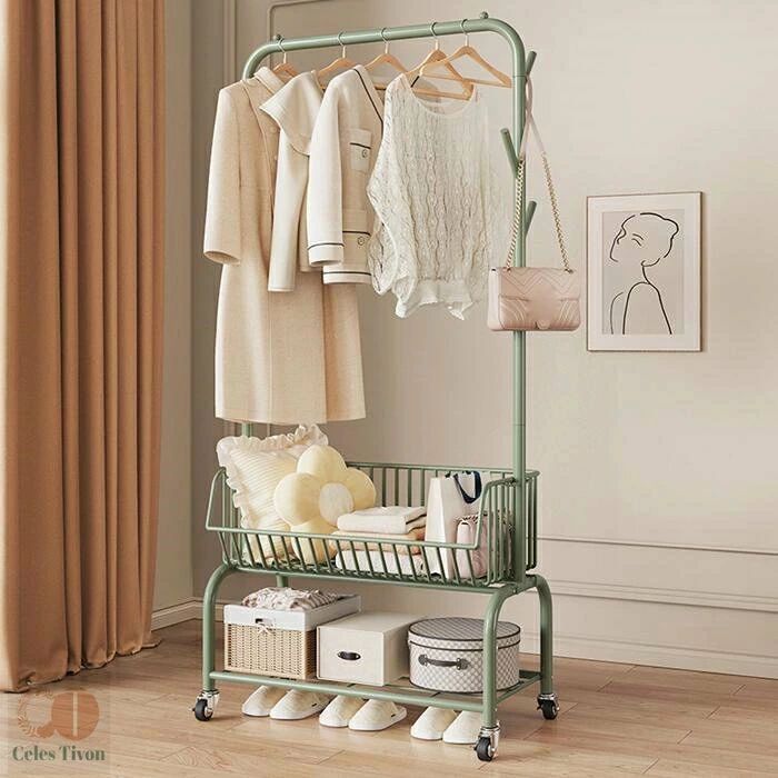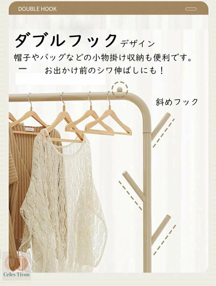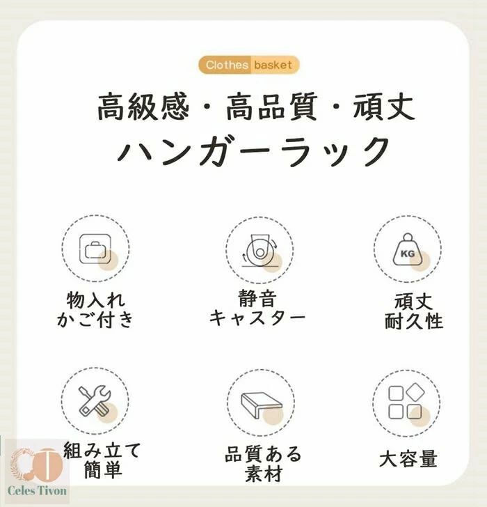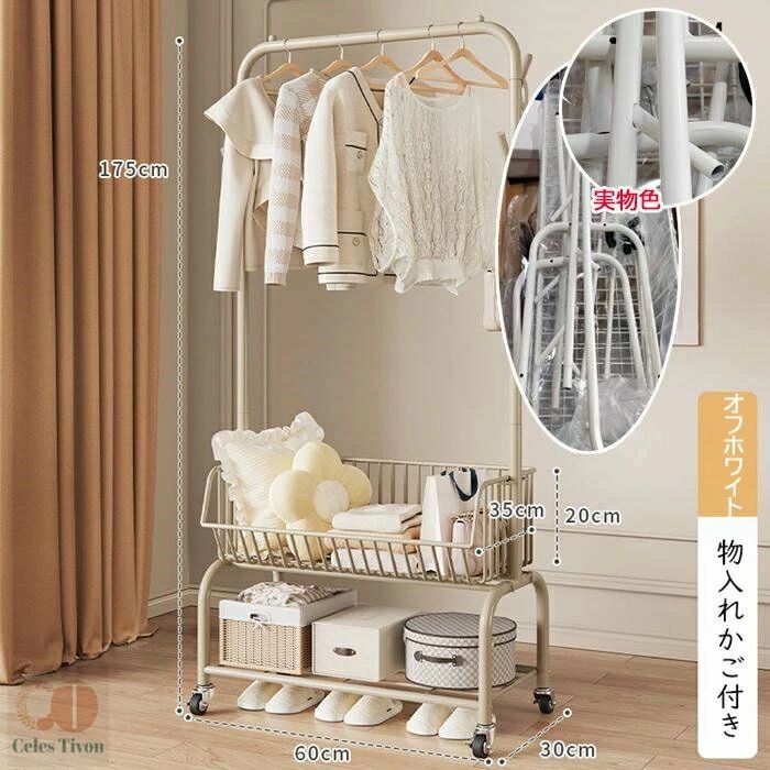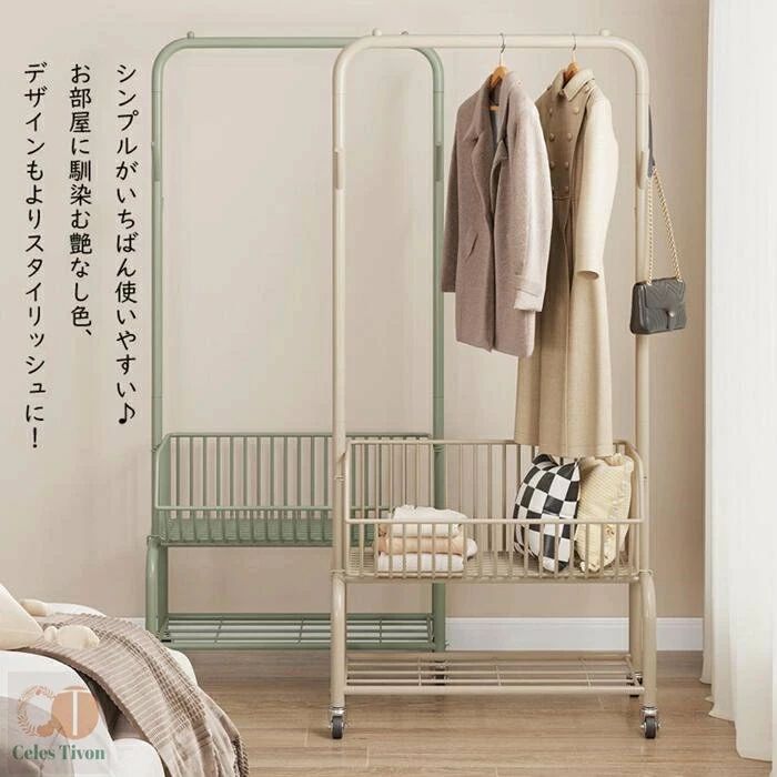 ハンガーフック 物入れかご付き キャス グリーン オフホワイト オフホワイト(かごなし) グリーン(かごなし) M(幅60CM) L(幅90CM)