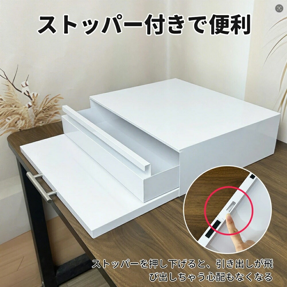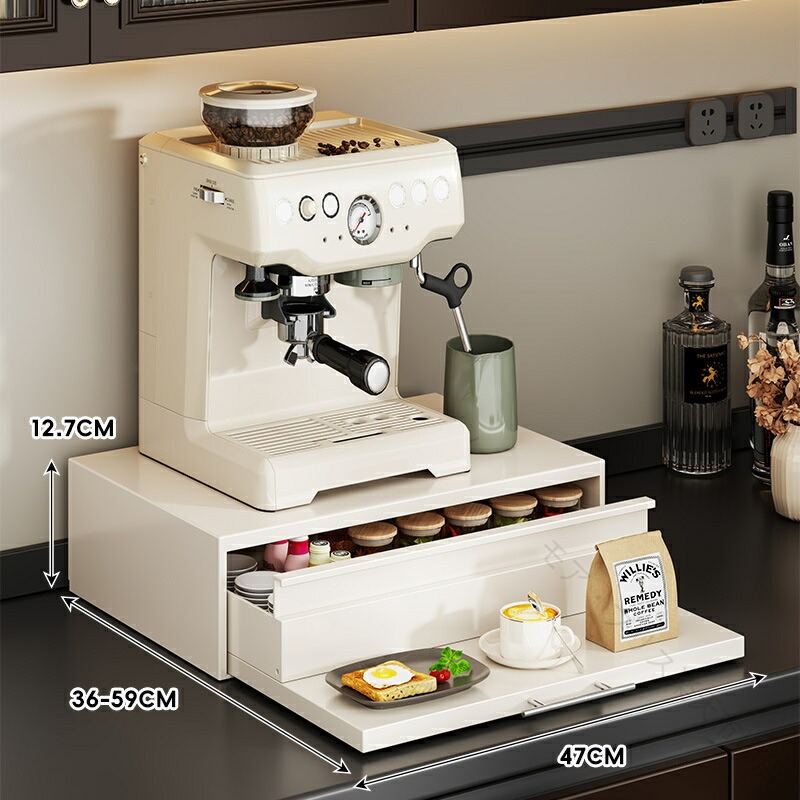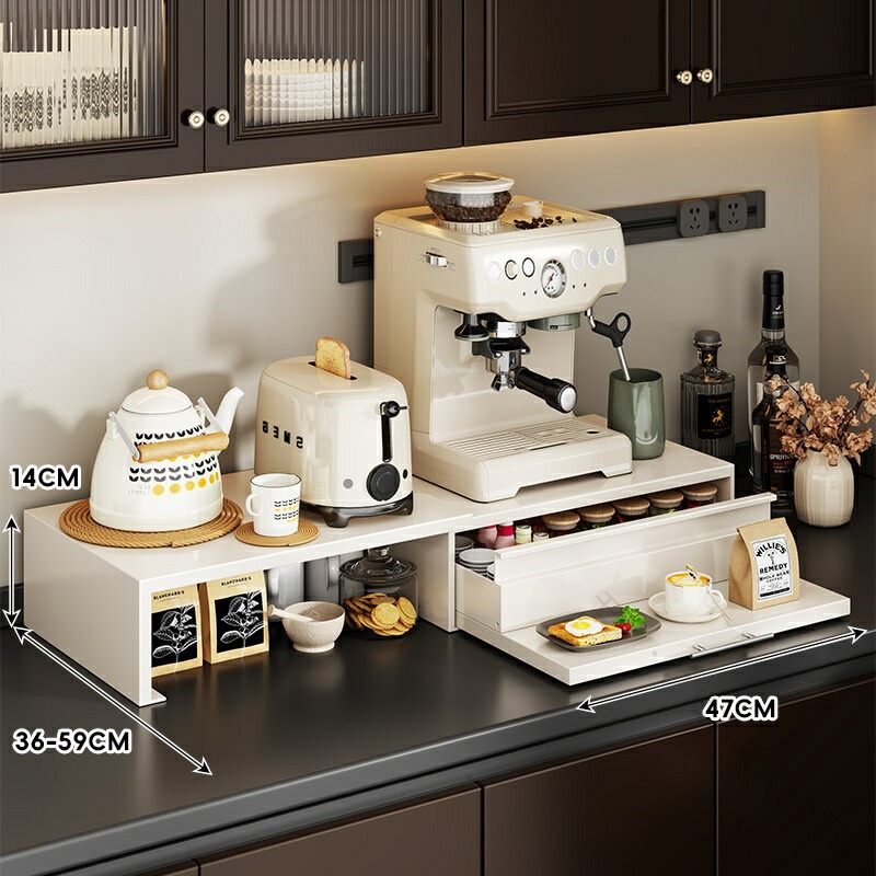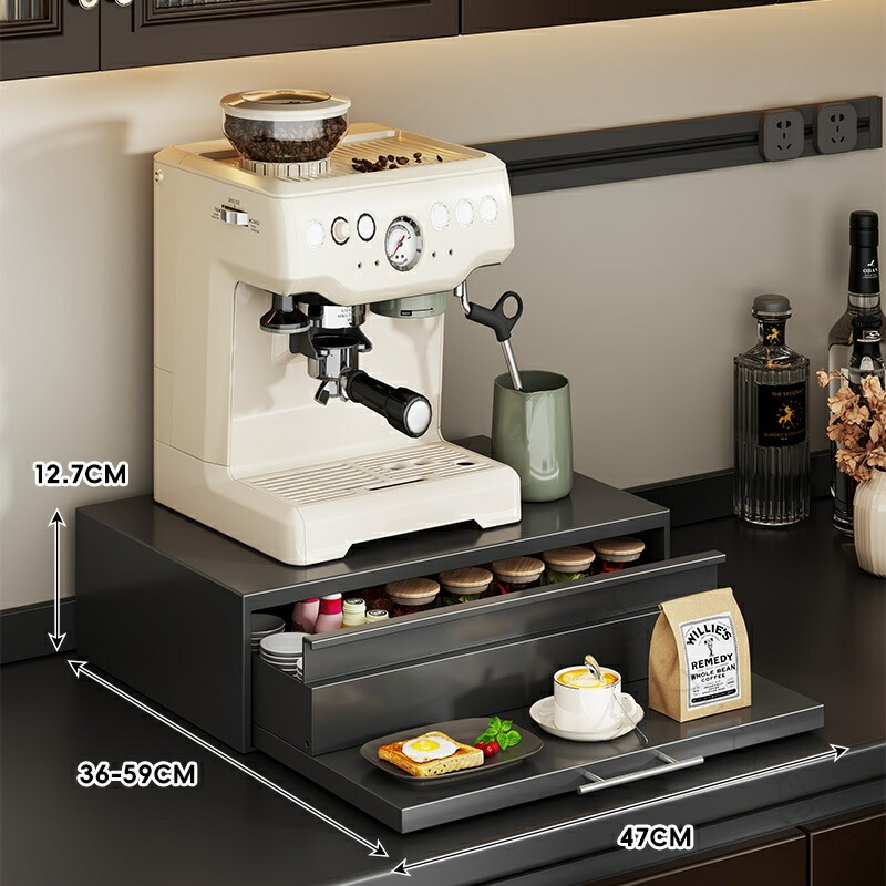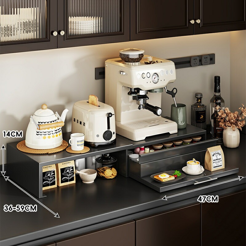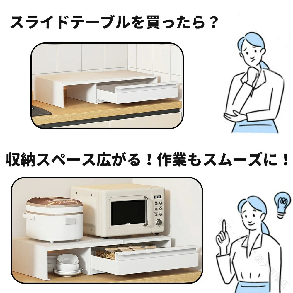 【省スペーススライドテーブル】 これです 家電下ラック,幅 47× 奥行 36× 高さ 13.5cm のコンパクト設計で,電子レンジ・オーブン・炊飯器などの大型家電から、トースター・ケトル・ミキサーなどの小型家電までサイズ不問で対応,上面に家電を置くだけで下部に引出しと収納式ワークテーブルが備わり、不用時は家電下に収納可能でスペースを取らない,家電下の隙間を垂直活用してキッチンをスッキリ整頓し、空間利用率を効率的に向上させます【2段式キッチン スライドテーブル】この 2 段式収納ラックは巧みな階層設計でスペースを効率的に活用し,幅 47cm× 深 23cm× 高 9.5cm の上層大容量ドローで調味料瓶や食器などをすっぽり収納して台の雑然を解消し,幅 47cm× 深 23cm の下層スライドテーブルは把手を軽く引くだけで朝食準備やちょい置き用のワーキングスペースに変身し不用時はスムーズに収納して余分なスペースを取らない、コンパクトキッチンのスペース拡張に最適な収納アイテムです【高品 安全構造】本レンジした収納は高肉厚一体成形炭素鋼を使用、表面に 3 層ナノスプレーを施しています,滑らかな表面は耐磨耗性に優れ、塗装が剥がれにくく、防水・防錆性能も備えており、マット仕上げにより高級感を醸し出しています,0.8 mmの厚肉金属により頑丈で長持ちし,卓全体で最大 50 KGの荷重を安定して支えることができます,構造設計が科学的に行われており、ガタツキが生じず、高い安定性を誇ります【より思いやりの設計】この電子レンジ下収納の細部まで完璧 1、引き出しに凹型把手を採用,力が均一でスムーズ開閉,スライドテーブルにはステンレス把手を付け、サイレントでカチカチしない 2、全引き出しにブレーキを内蔵、意外な滑出し防止,周囲にフルガードで小物の落下を防ぐ3、金属表面に特殊コーティングを施し,布で拭けば簡単に清掃,キッチンの高温多湿環境でも丈夫です【保証】このキッチンラックはほぼ完成品で、外引き把手のネジ締めのみの簡単組立で、工具と説明書付属,数分でセットアップ可能で、ほぼ組み立て不要!