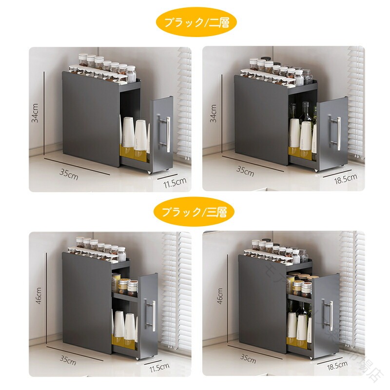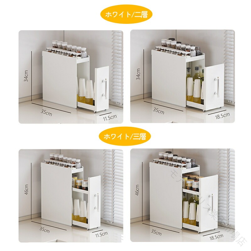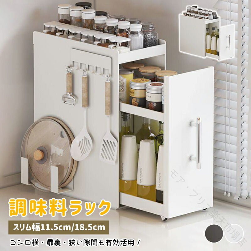 幅は11.5cmと18.5cmの2タイプから選択可能で、コンロ脇の隙間や冷蔵庫横、キッチン扉の裏面など、これまで活用が困難であったデッドスペースにも適切に設置できます。また、2段または3段の可動式棚を備えており、調味料瓶の高さに応じて自由に位置調整が可能であり、大型のオイルボトルから小型のスパイス缶まで、さまざまなサイズの調味料を効率的に整理整頓できます。