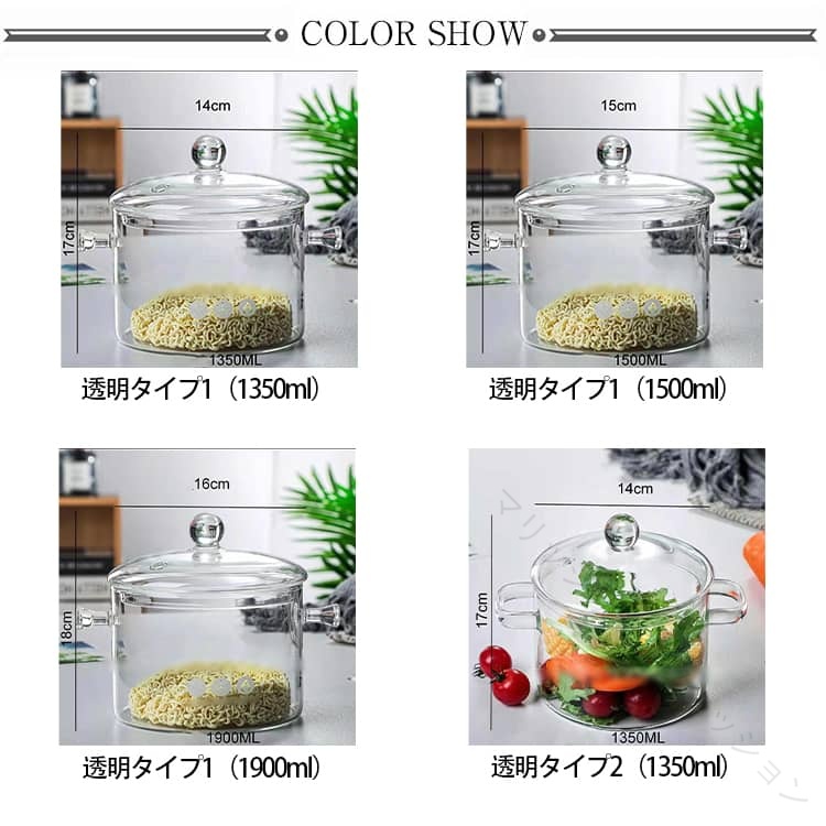 ガラス 鍋 卓上 両手 なべ 透明 蓋 透明*タイプ1(1350ml) 透明*タイプ1(1500ml) 透明*タイプ1(1900ml) 透明*タイプ2(1350ml) 透明*タイプ2(1500ml) 透明*タイプ2(1900ml)