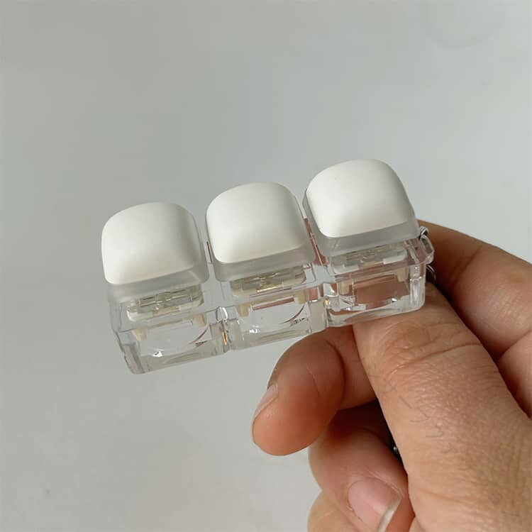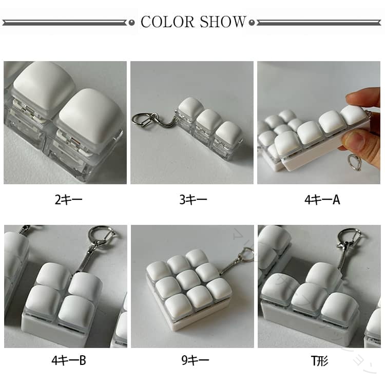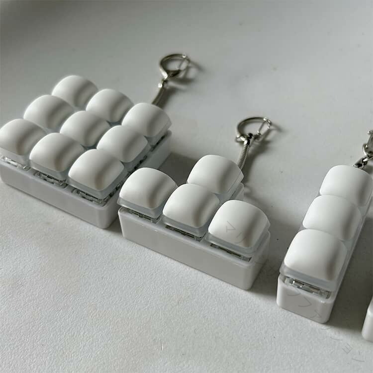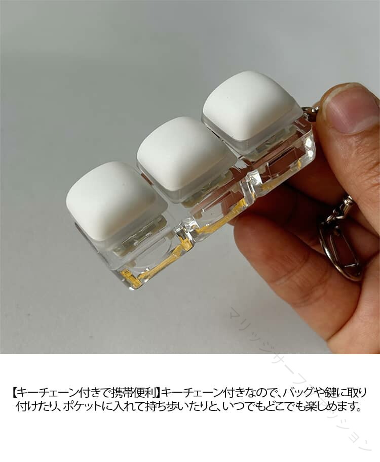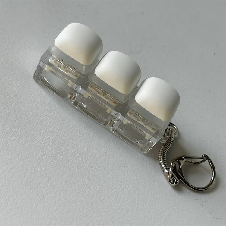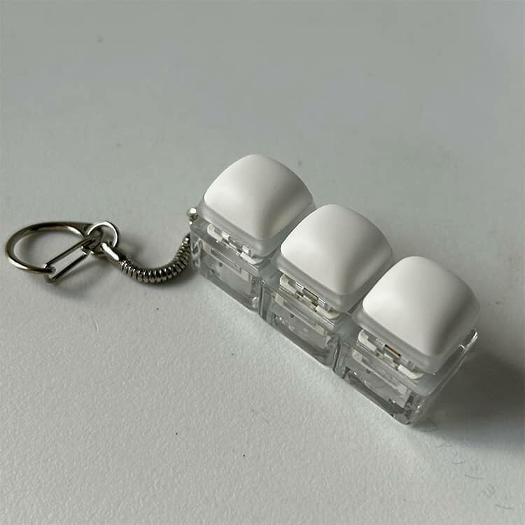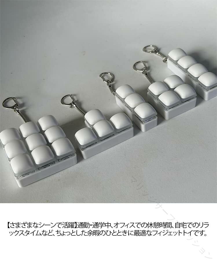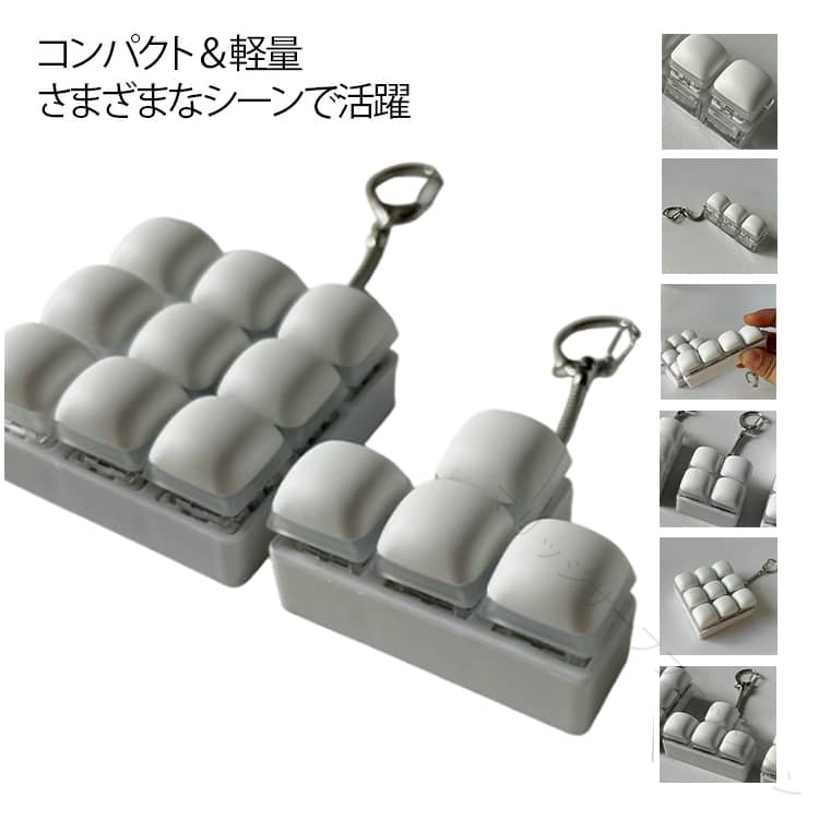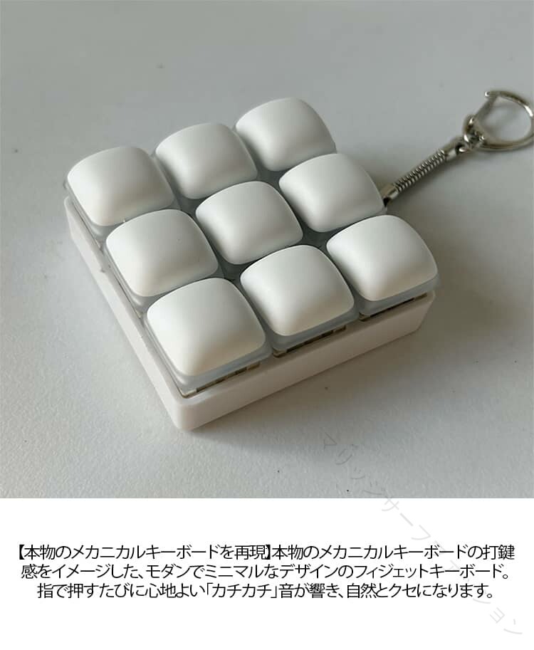 .ストレス解消 に最適 な クリッカー フィジェット キーホルダー は メカニカル キーボード タイプ の 3キー 4キー 9キー バリエーション で 青軸 の タクタイル 感触 と 音 が 特徴 です。暇つぶし や 不安解消 にも 向いており、手遊び に最適 な フィジットトイ として 大人 や 子供 に おしゃれ な プレゼント ギフト としておすすめの 白 カラー の グッズ です。。