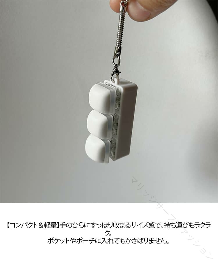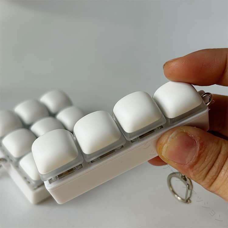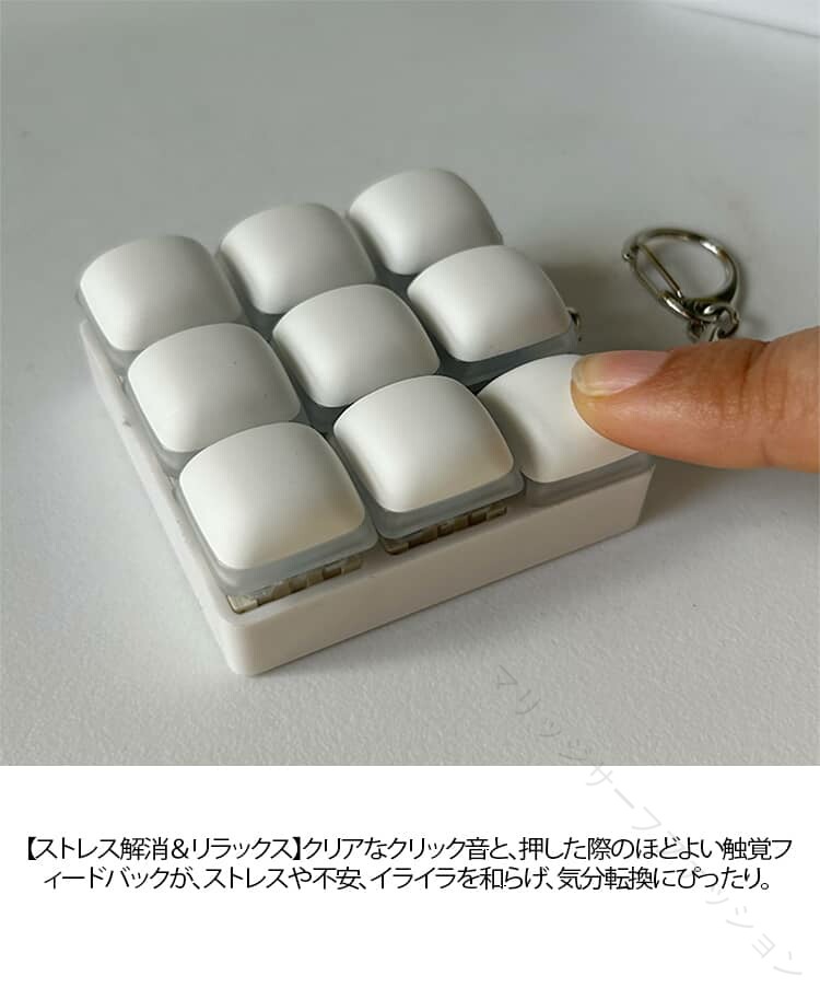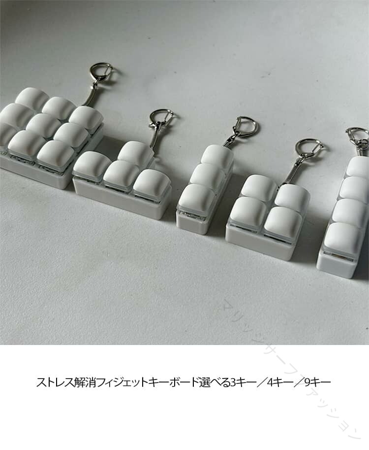 ストレス解消フィジェットキーボード選べる3キー/4キー/9キー【本物のメカニカルキーボードを再現】本物のメカニカルキーボードの打鍵感をイメージした、モダンでミニマルなデザインのフィジェットキーボード。指で押すたびに心地よい「カチカチ」音が響き、自然とクセになります。【ストレス解消&リラックス】クリアなクリック音と、押した際のほどよい触覚フィードバックが、ストレスや不安、イライラを和らげ、気分転換にぴったり。【コンパクト&軽量】手のひらにすっぽり収まるサイズ感で、持ち運びもラクラク。ポケットやポーチに入れてもかさばりません。【キーチェーン付きで携帯便利】キーチェーン付きなので、バッグや鍵に取り付けたり、ポケットに入れて持ち歩いたりと、いつでもどこでも楽しめます。【さまざまなシーンで活躍】通勤・通学中、オフィスでの休憩時間、自宅でのリラックスタイムなど、ちょっとした余暇のひとときに最適なフィジェットトイです。
