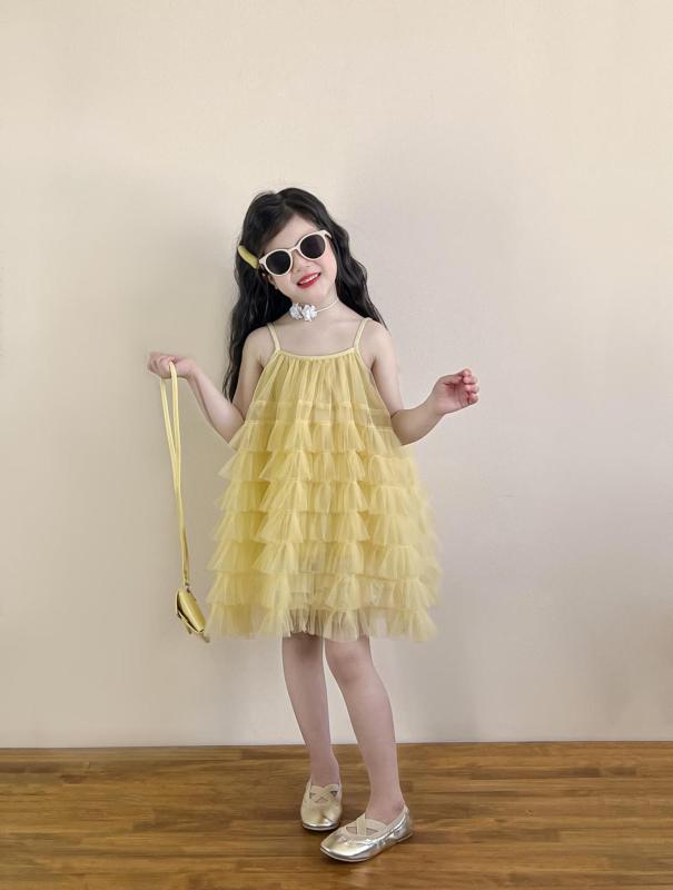 ワンピース 女の子用 夏 かわいい 黄色 ケーキ風 キャミソール チュールスカート ふわふわ レイヤード デザイン 波状 花びら 縁取り ショーツ セット 軽やか コットン 混 通気性 良い ピ 素材