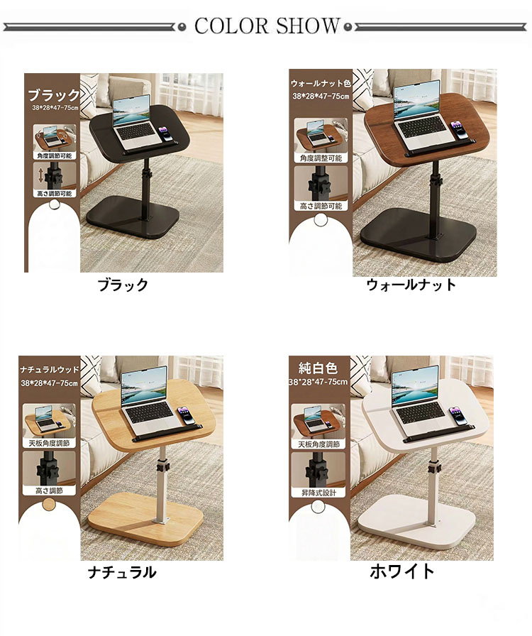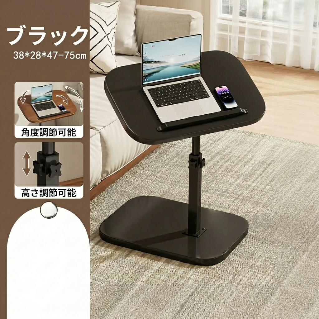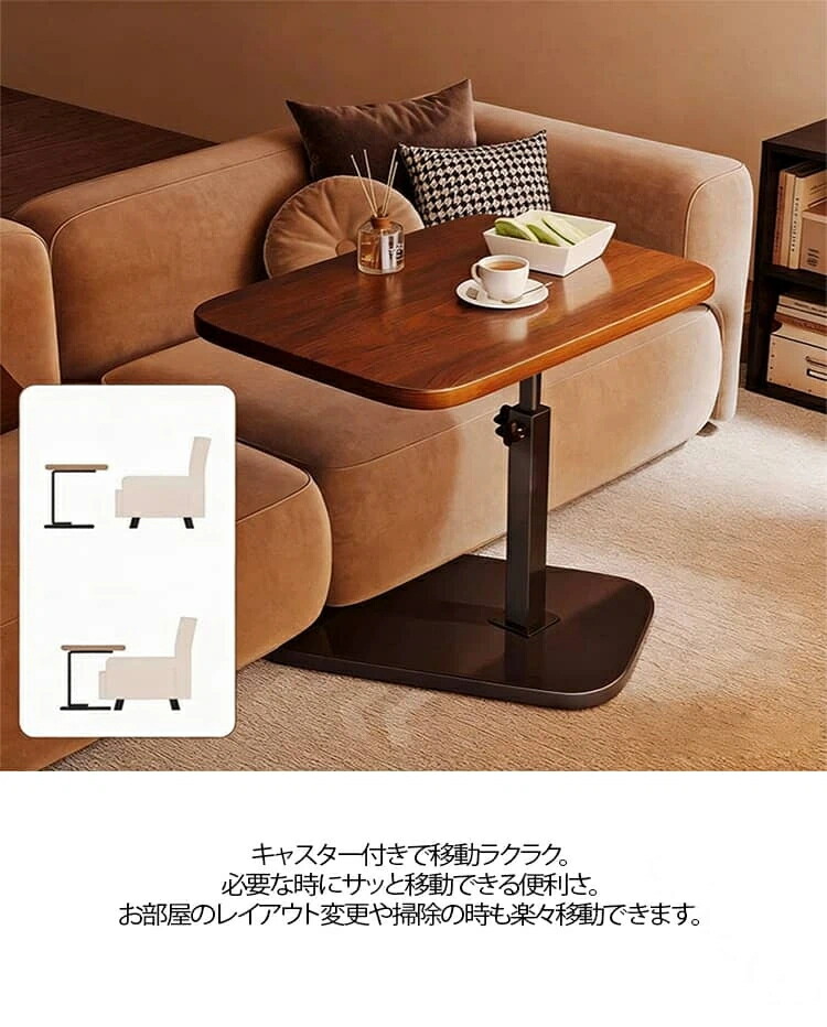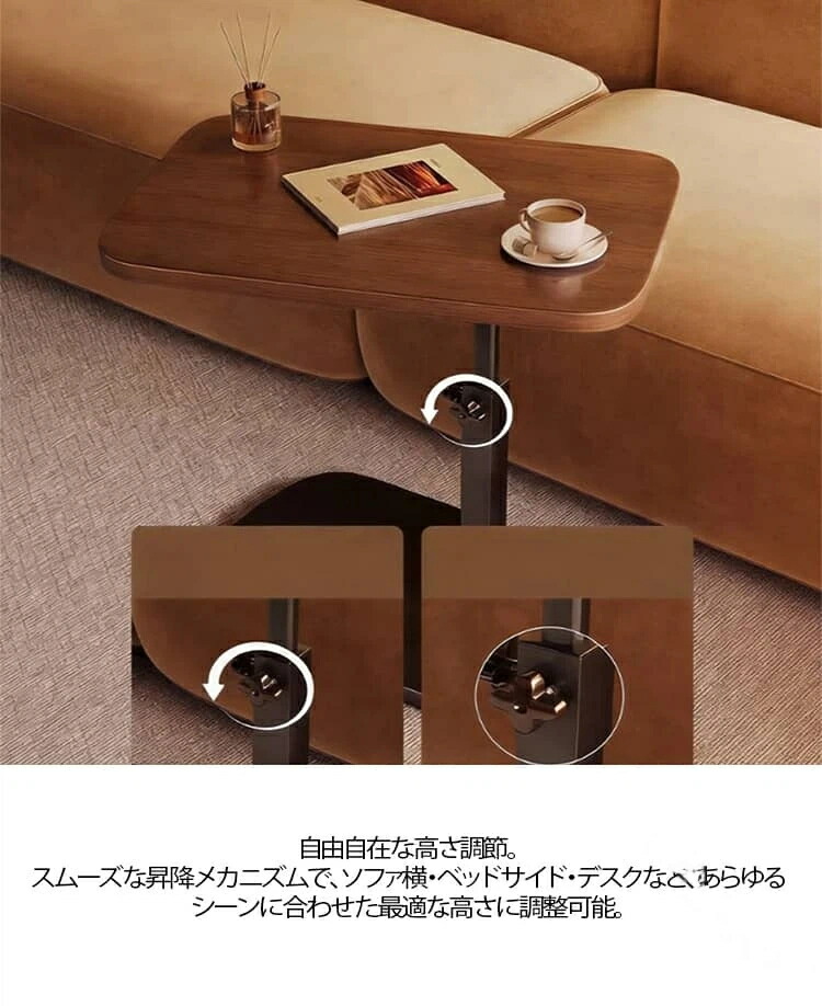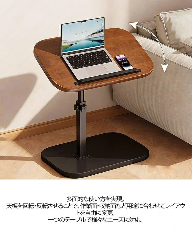 .耐水 性能 に優れた 昇降式 の サイドテーブル は 360度 自由回転 可能 で ソファーテーブル として 最適 です。木製風 デザイン で 高温 に 強く 耐荷重 が良く 安定 した 耐久性 を誇ります。小型 で 水 にも 強いため 様々な 使用シーン に対応可能です。。