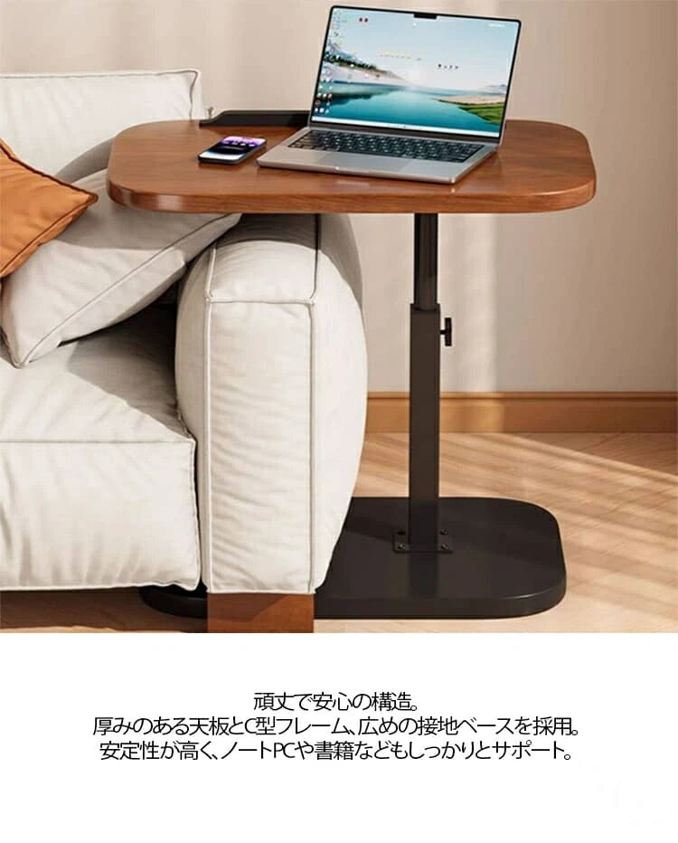 自由自在な高さ調節スムーズな昇降メカニズムで、ソファ横・ベッドサイド・デスクなど、あらゆるシーンに合わせた最適な高さに調整可能。多面的な使い方を実現天板を回転・反転させることで、作業面・収納面など用途に合わせてレイアウトを自由に変更。一つのテーブルで様々なニーズに対応。頑丈で安心の構造厚みのある天板とC型フレーム、広めの接地ベースを採用。安定性が高く、ノートPCや書籍などもしっかりとサポート。スリムながら大容量対応シンプルなC型デザインで足元が広々と使えながら、十分な耐荷重を実現。リビングや寝室の限られたスペースでも圧迫感なく設置可能。キャスター付きで移動ラクラク必要な時にサッと移動できる便利さ。お部屋のレイアウト変更や掃除の時も楽々移動できます。