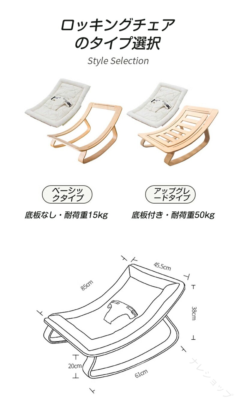 ベーシック(耐荷重15kg)とアップグレード(底板付き・耐荷重50kg)の2タイプ展開。新生児から安心して長くご使用いただけます。