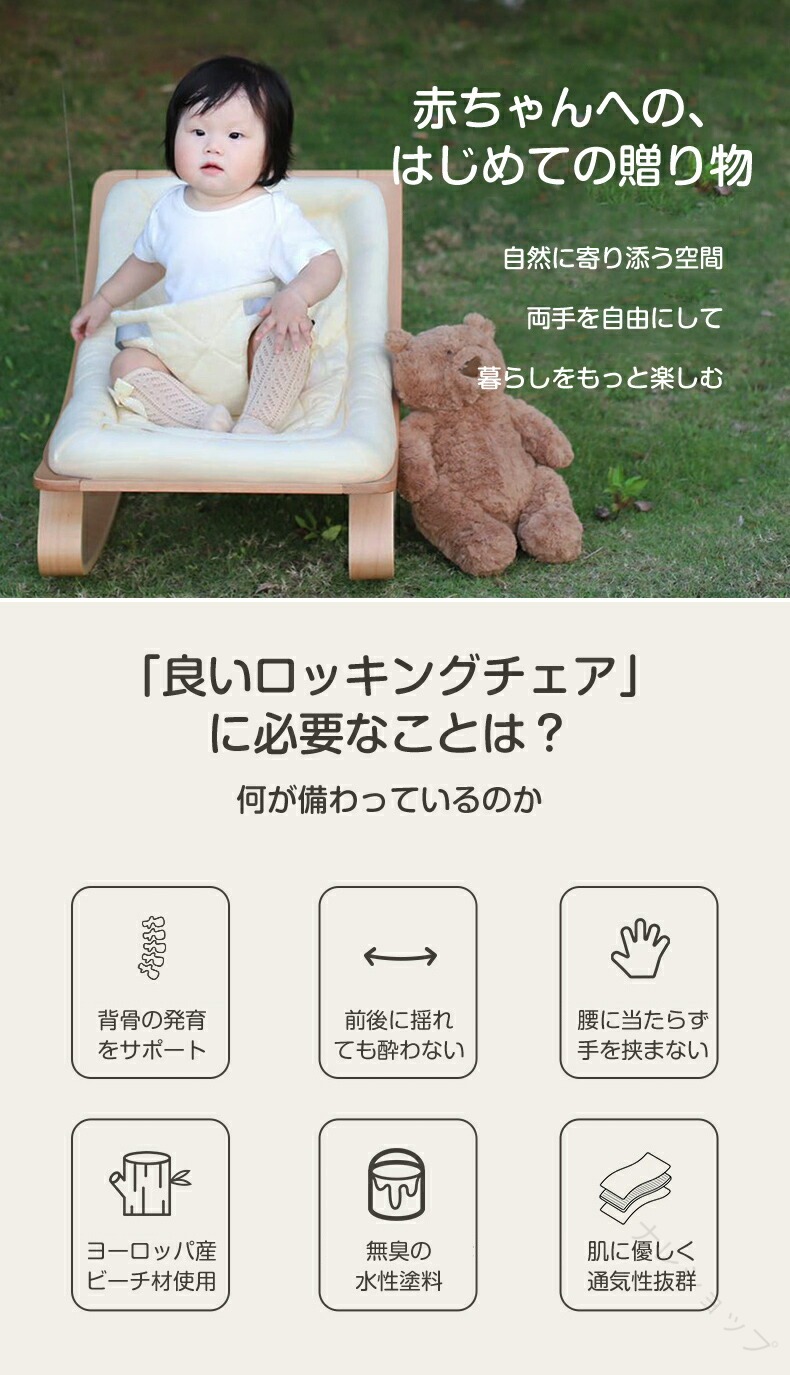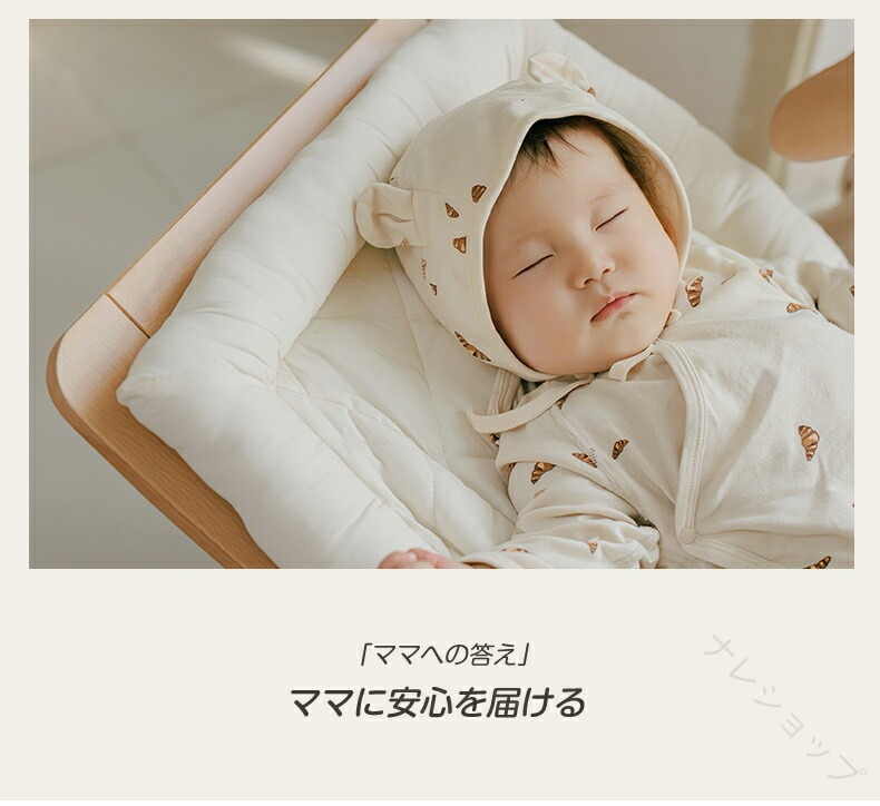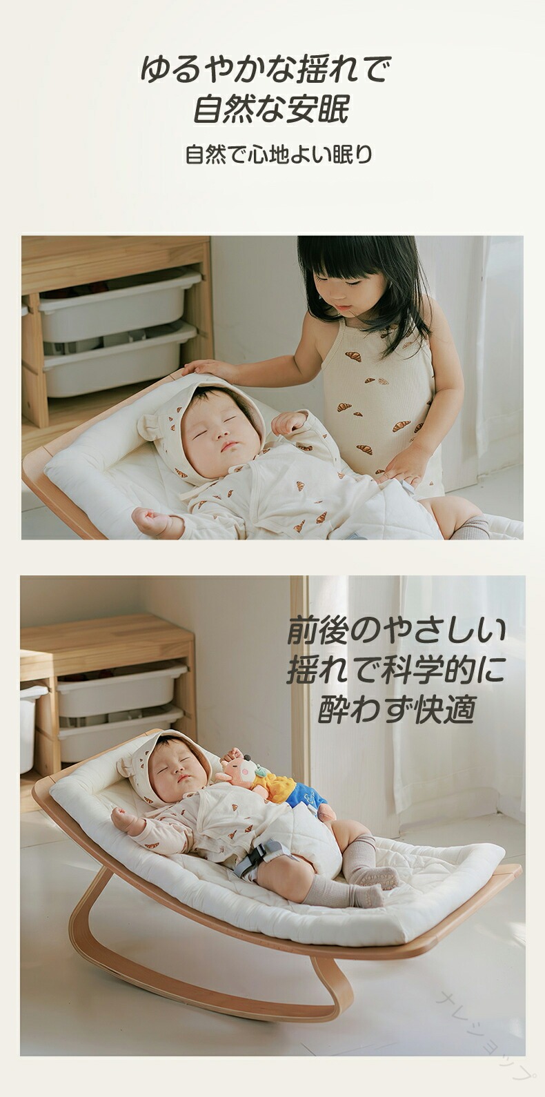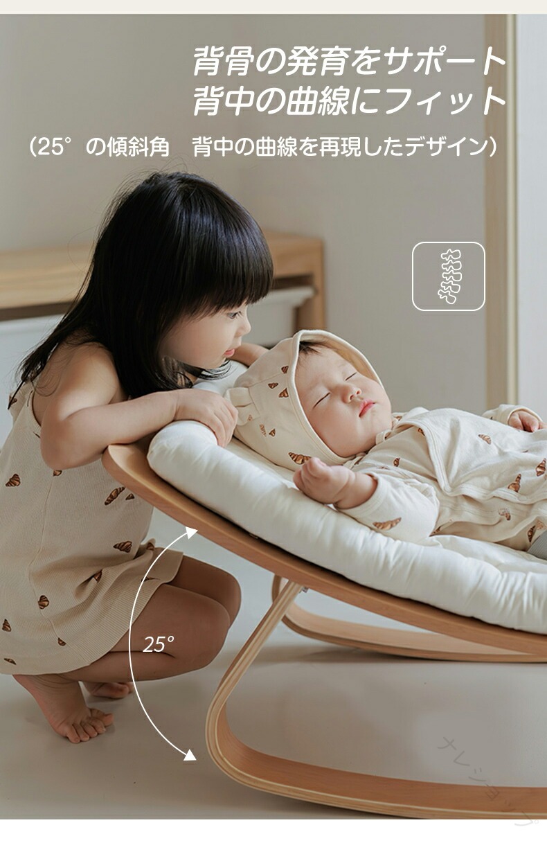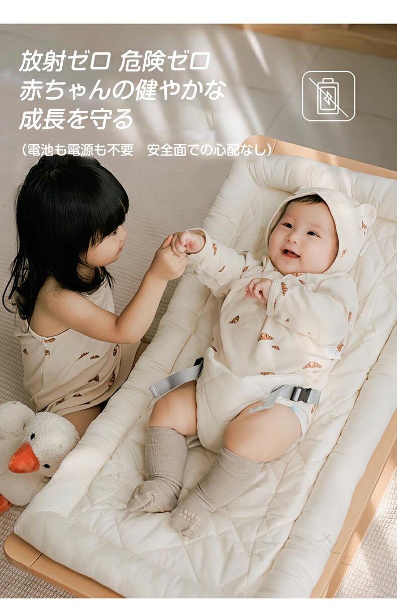 電池や電源不要。前後に揺れても酔わない設計で、やさしいリズムが赤ちゃんを安らぎへ導きます。