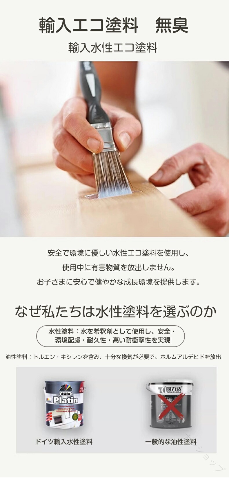 ヨーロッパ産ブナ材を使用。植物由来の水性エコ塗料で、無臭&有害物質ゼロ。赤ちゃんの成長環境を守ります。