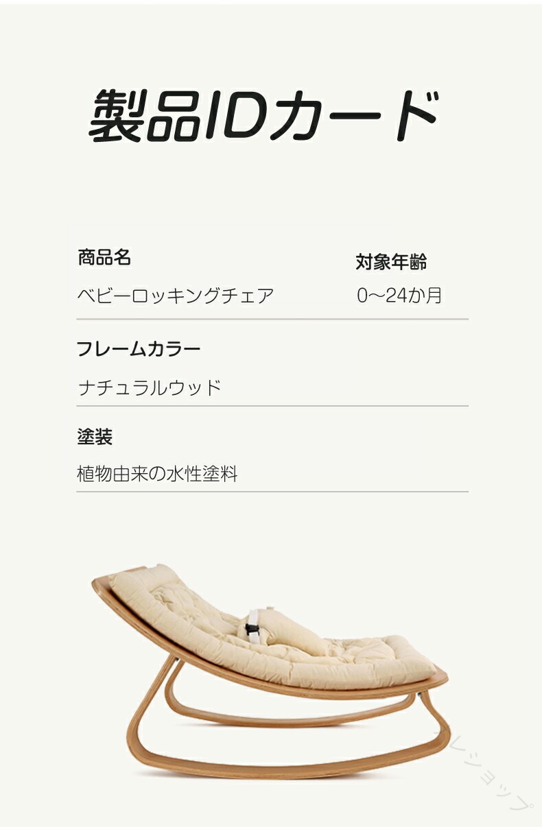 *対象年齢について 本製品は新生児から6歳までを目安に設計されています。必ず対象年齢・体重の範囲内でご使用ください。*必ず保護者の監督下でご使用ください 赤ちゃんをバウンサーに乗せたまま放置しないでください。必ず保護者がそばで見守ってください。*設置場所について 平らで安定した床面に設置してください。高所やベッドの上、不安定な場所では使用しないでください。*使用方法について 本製品は自然な揺れを楽しむ構造です。無理な力で強く揺らしたり、複数人で同時に乗せることは避けてください。*耐荷重について 最大耐荷重は80kgです。必ず耐荷重範囲を守ってください。超過すると破損や事故の原因となります。*お手入れ方法 分離式シートは取り外して洗浄可能です。使用後はよく乾かしてから再度装着してください。濡れたまま保管するとカビや異臭の原因となります。*素材と安全性について BPAフリーの抗菌素材を使用していますが、火気や高温の近くでは使用しないでください。*組み立て・調整時の注意
