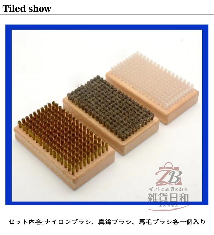 曲げに強く復元力抜群のナイロンブラシ、汚れをしっかり取り除く真鍮ブラシ、最終仕上げに適した馬毛ブラシ。手に馴染みやすい木製ハンドル。