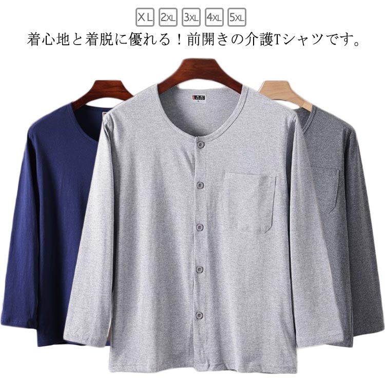 シャツ 長袖 クールネック 介護用 ルームウェア 肌着 下着 男性用 前開き インナー 通気性