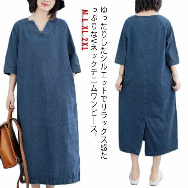 デニム ワンピース vネック レディース ロングワンピース 五分袖 デニムワンピース ゆったり 体型カバー バックスリット 大きいサイズ ミモレ丈 お洒落 カジュアル 春 夏 秋 L XL 2XL M
