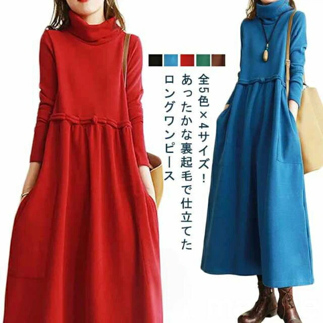 ロングワンピース 秋冬 ハイネックワンピース 長袖 ゆったり マキシワンピース マキシ丈 冬服 裏起毛 あったか 重ね着 ポケット付き カジュアル ゆったり体型カバー シンプル 大きいサイズ 通 無地
