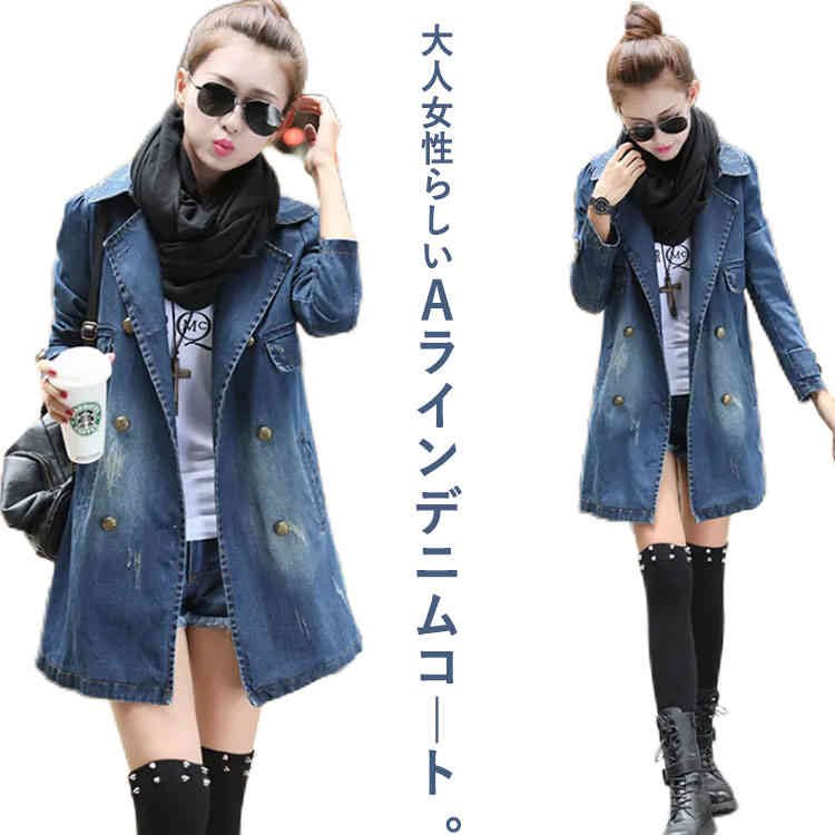 デニムコート デニムジャケット レディース ダメージ加工 ウォッシュ加工 デニム トレンチコート ミドル丈 アウター スプリングコート Gジャン チェスターコート 秋冬 春服 ロングコート
