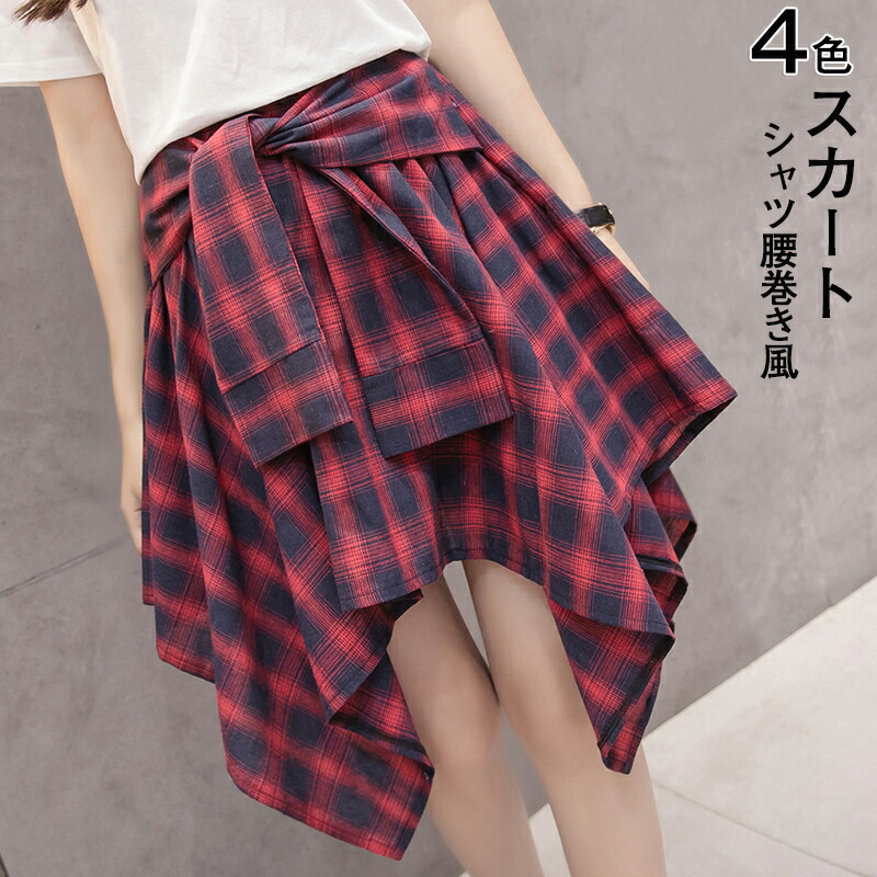 チェック柄 レイヤード 付け裾 シャツ腰巻き風スカート