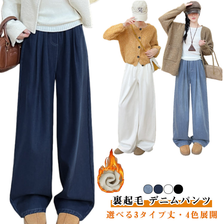 3丈から選べる 裏起毛 デニムパンツ レディース 秋冬 ウエストゴム ジーンズ 防寒 あたたかい ワイド デニム パンツ ストレート ワイドパンツ ボトムス ゆったり 女性 低身長 高身長 体型カバー