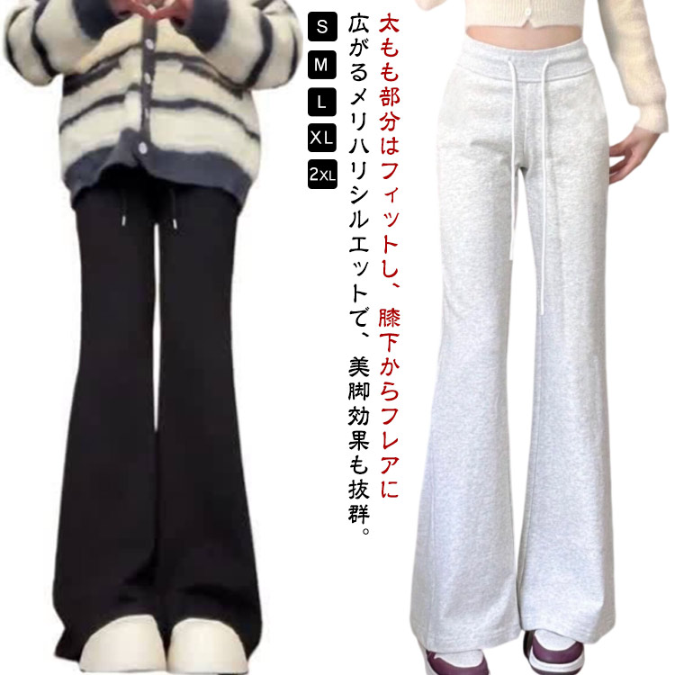 ストレッチ シンプル 春 フレアパンツ 脚長効果 パンツ おしゃれ ベルボトムパンツ イージーパンツ レディース 美脚パンツ スウェット ロング ウエストゴム 秋 着瘦せ 春秋 秋冬