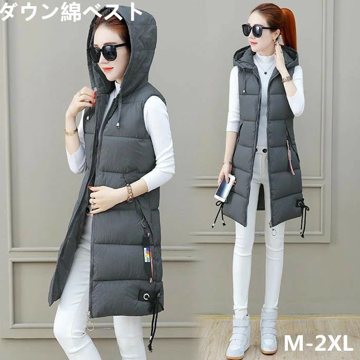 ダウンベスト レディース 中綿入り 着痩せ フード付きベスト 冬物 帽子付き 体型カバー 冬 カジュアル ノースリーブ ロングベスト 暖かい