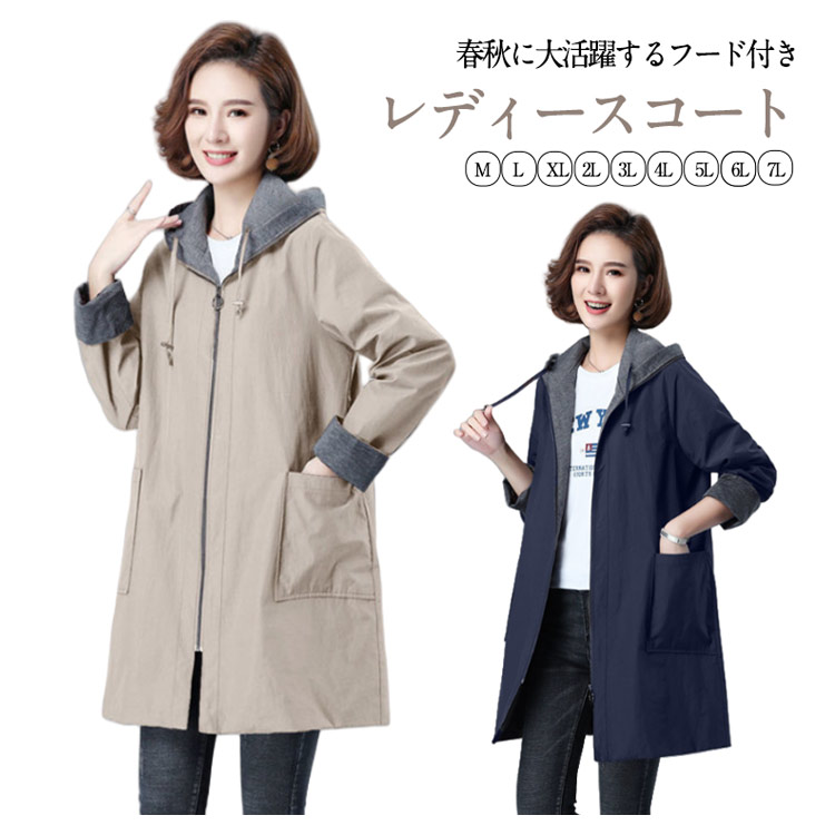 フード付き M-7L コート マウンテンパーカー 羽織り レディース アウター ブルゾン ジャンパー ロング丈 ジャケット 40代 50代 無地 春物 大きいサイズ ジ 大人可愛い