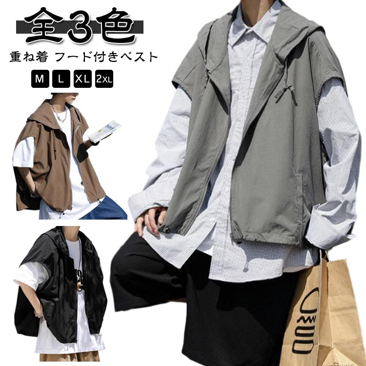 男女兼用 重ね着 フード付きベスト ジャケット ジップアップパーカー はおり カット 春 ビッグサイズ 無地 トップス