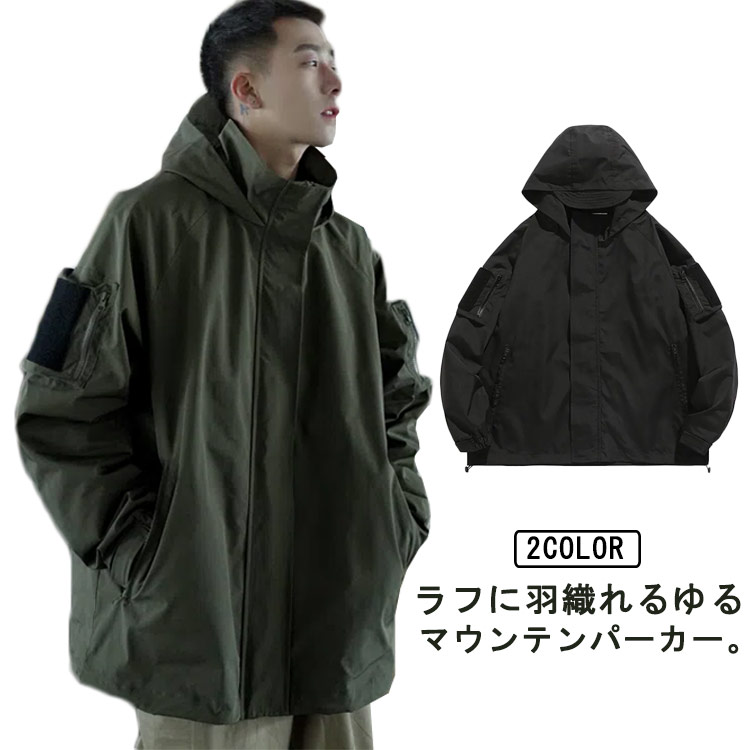 マウンテンパーカー メンズ ジャケット ウインドブレーカー ゆったり 大きいサイズ ブルゾン フード付き ミリタリー アウター ジャンパー 無地 春 秋 冬 韓国ファッション