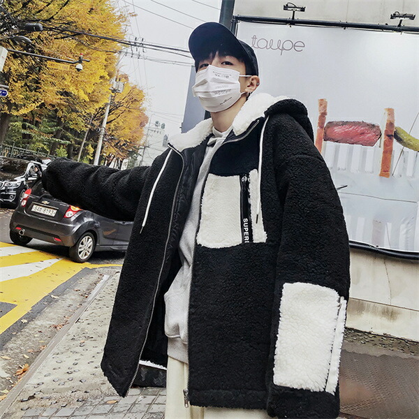 ボアジャケット ラムウール メンズ フリースジャケット コート フード付き ャケット 裏起毛 スプライス 男性 アウター もこもこ 冬服 フリース アウター 防寒 厚手 暖かい
