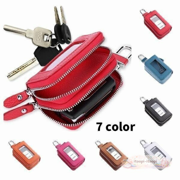クリア窓付き 車の鍵 キーケース スマートキー スマートキーケース ダブルキーケース ダブルファスナータイプ 本革 収納 スマートキーカバー カバー 2つのキー 収納可能 ケース