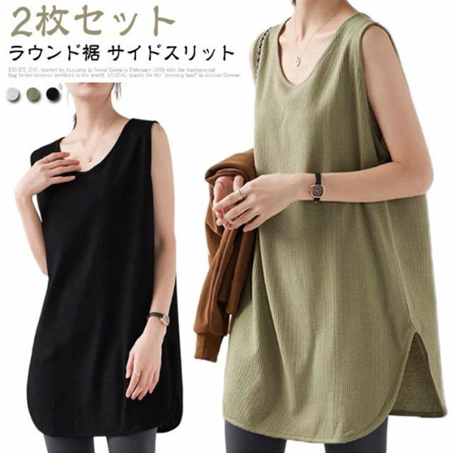 ラウンド裾 サイドスリット タンクトップ 重ね着 体型カバー レイヤード インナー ロング丈 ロングタンクトップ ノースリーブ レディース トップス ゆったり お尻カバー 大きいサイズ ラウンドネック