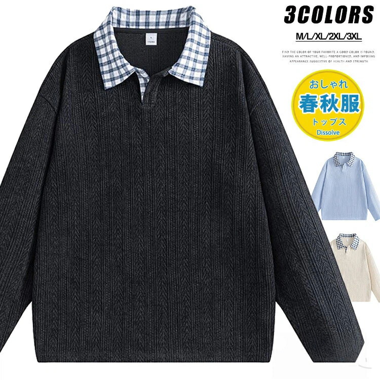 メンズ ポロシャツ 長袖 シャツ トップス カジュアル 無地 春 秋 薄手 重ね着風 ロン 通勤 シンプル