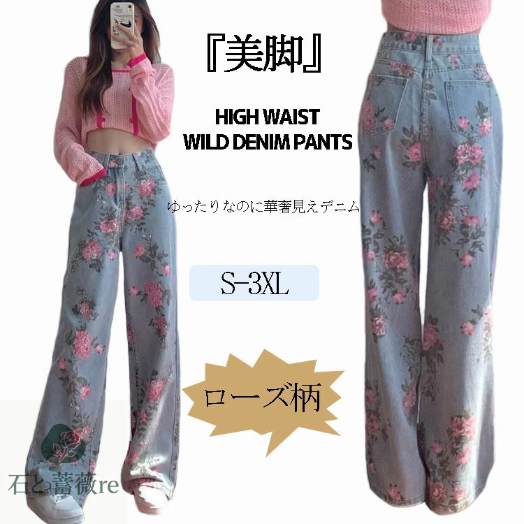 デニム パンツ デニム ローズ柄 可愛い キュート ワイドパンツ
