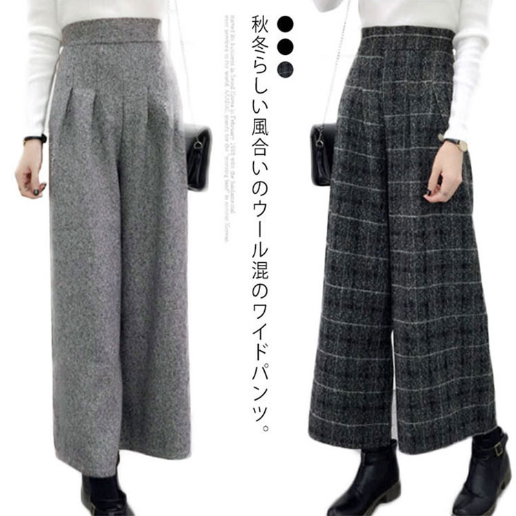 ガウチョパンツ ウール混 パンツ 9分丈 スカンツ スカーチョ ボトムス ハイウエスト ワイドパンツ レディース 秋冬 チェック柄 タック入り ゆったり あったか