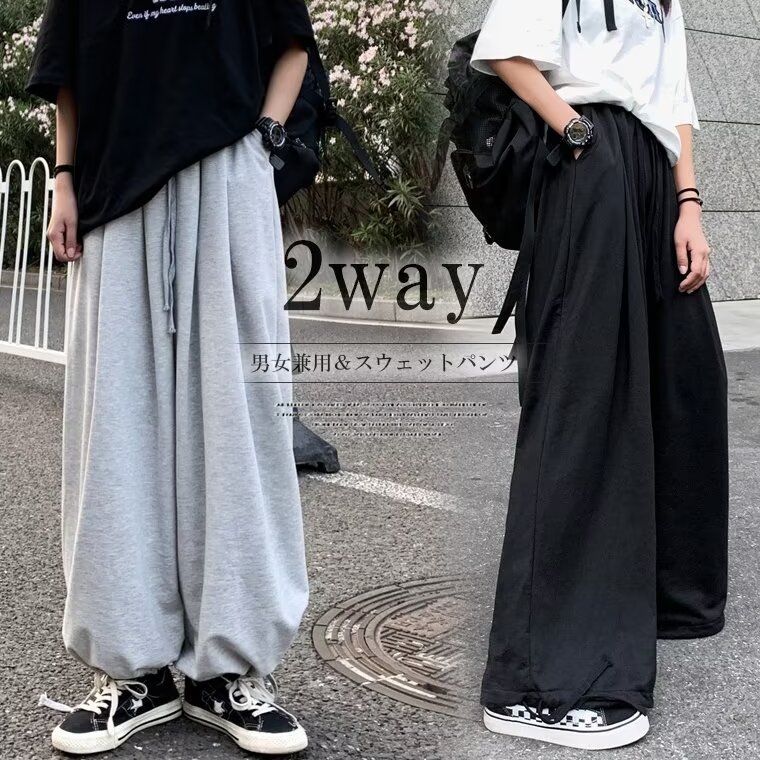 スウェットパンツ ワイド レッグ 2way ボトムス ズボン カジュアルパンツ ルーズワイド スポーツ 裾の絞り具合によって雰囲気を変える 全2色 ヒップホップ ダンス衣装 ストリート系 裾絞れる仕様