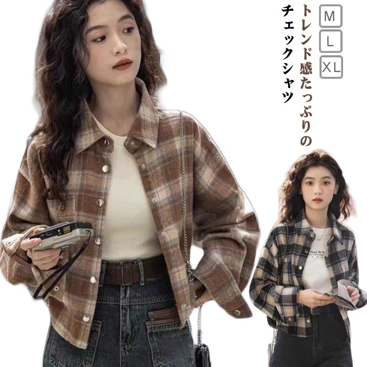【送料無料】チェックシャツ レディース 起毛 短丈 シャツ ブラウス シャツジャケット 羽織り 重ね着 ゆったり 大人カジュアル フェミニン ブラウン ワインレッド ブラック