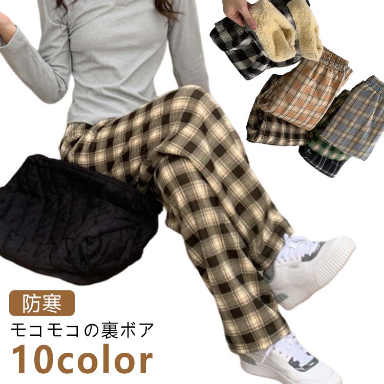 裏ボア チェック柄 パンツ レディース ルームウェア 秋冬 暖かい 厚手 部屋着 ルームパンツ カジュアル ワンマイルウェア リラックス 防寒 保温 ズボン ワイドパンツ ロングパンツ 裏起 ボトムス