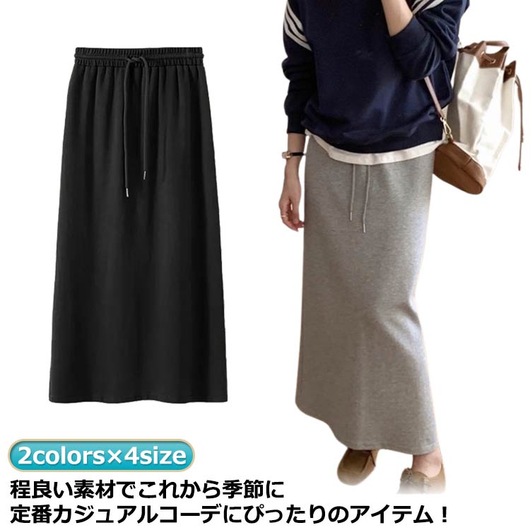 マキシ丈 ロングスカート スカート 通勤 ウエストゴム+紐 タイトスカート ハイウエスト 黒 無地 ストレッチ スリット入り グレー バックスリット ブラック お洒落 お出掛け シン コーデ