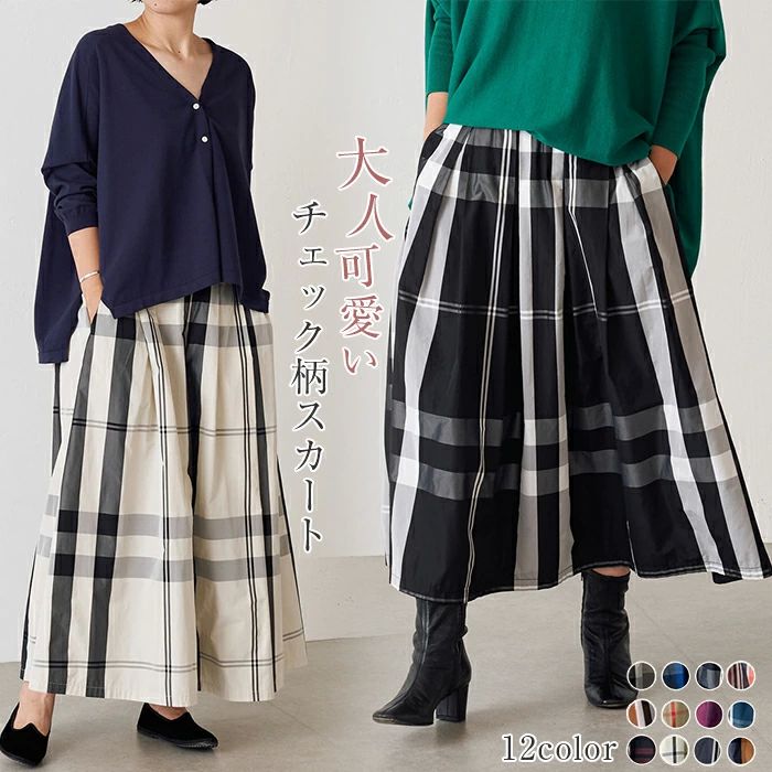 大人可愛 おしゃれ 体型カバー Aライン きれいめ カジュアル ボリューム フレア ロング丈 チェック柄 夏 春 レディース スカート