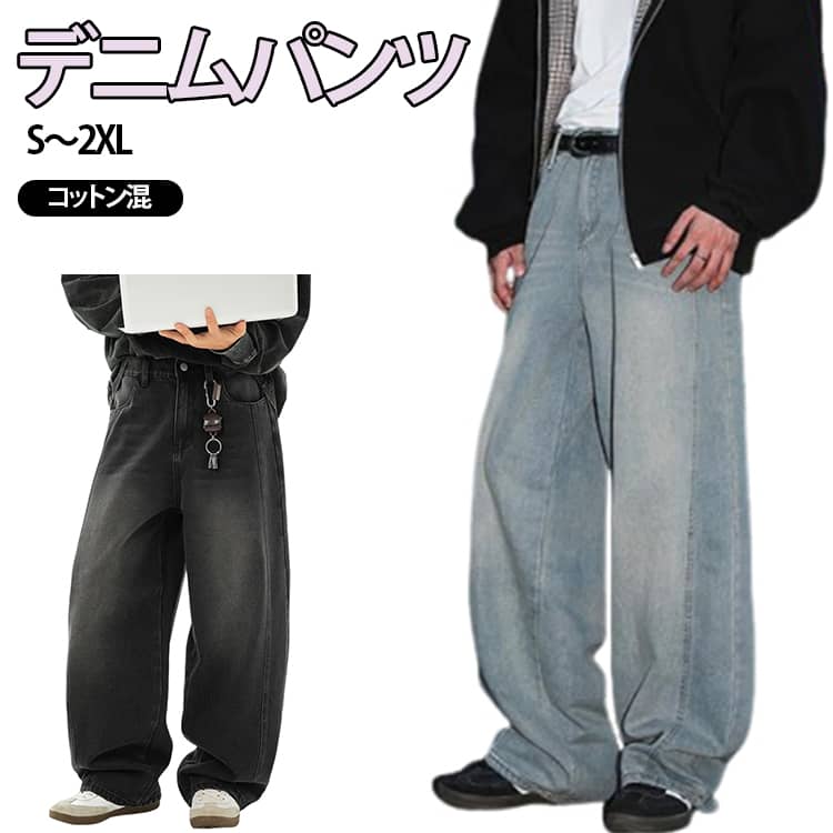 デニムパンツ メンズ ジーンズ ワイドパンツ ワイドデニム ゆったり ストリート バギーパンツ ジーパン カジュアル 無地 調整紐 リラックス カッコイイ おしゃれ 春 夏 秋 綿混 ダボダボ 大 冬