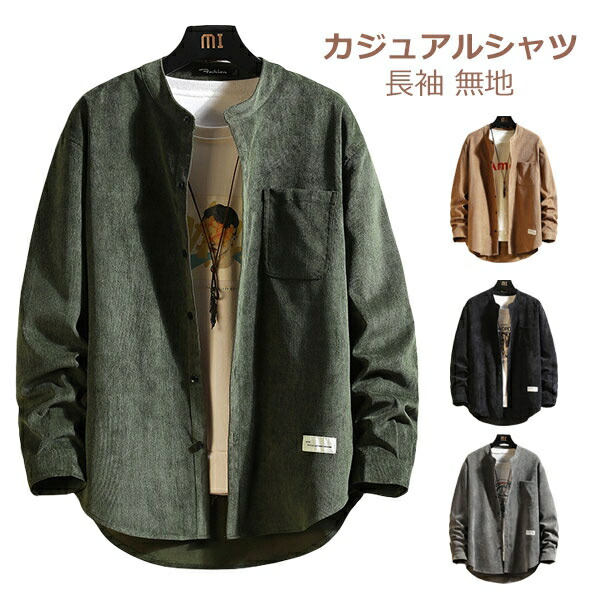 コーデュロイ シャツ カジュアルシャツ メンズ 秋服 長袖シャツ 無地 トップス ビッグシルエット バンドカラー スタンドカラー ゆったり メンズシャツ 胸ポケ オーバーサイズ
