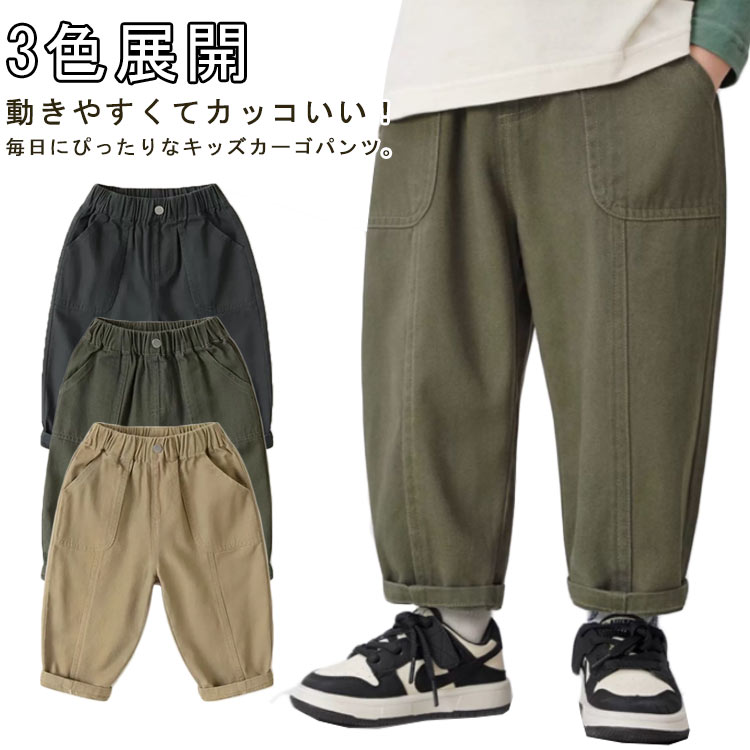 キッズ カーゴパンツ 男の子 ロングパンツ 長ズボン サイドポケット ウエストゴム 無地 カッコいい ボトムス 小学生 中学生 ファッション 通園 通学 ベビー服 ダークグレー グリーン カーキ 春服