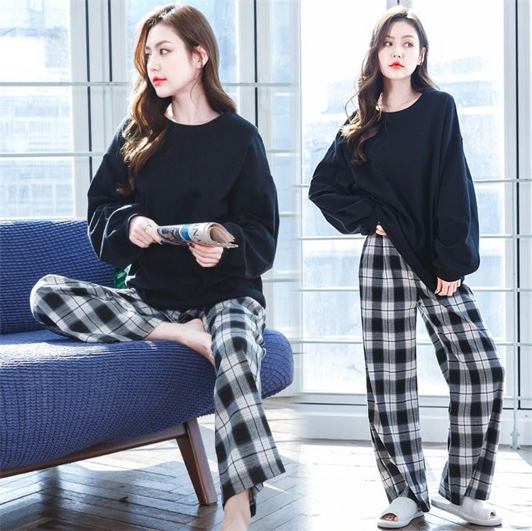 韓国 ナイトウェア シンプル 可愛い 部屋着 長袖 春秋 パジャマ ルームウエア レディース セットアップ 上下セット チェック柄