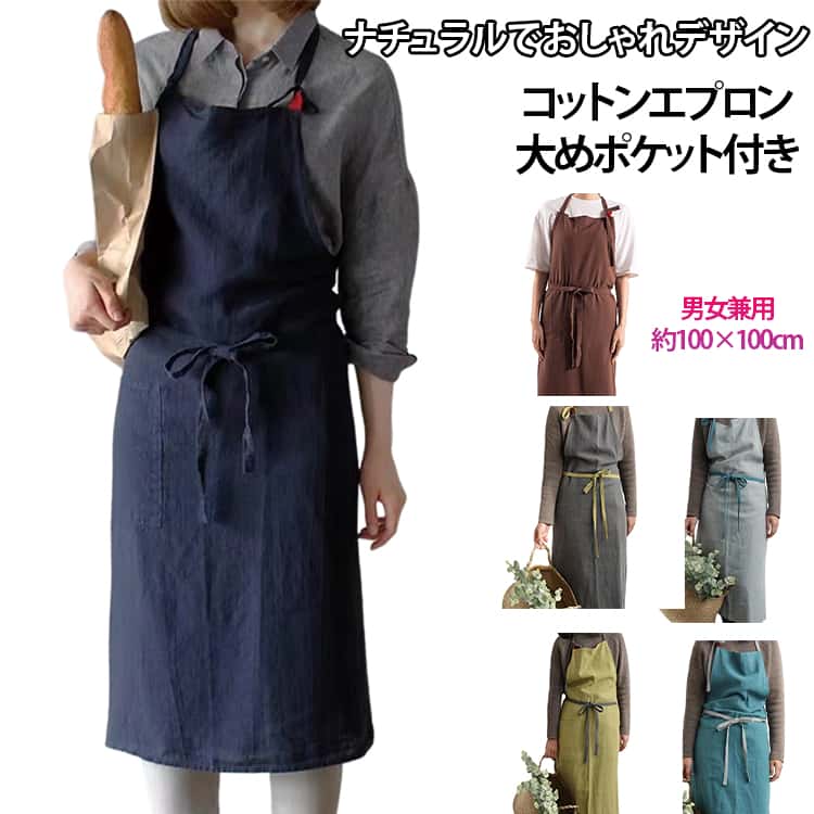 コットン エプロン おしゃれ ワンピース 首掛け レディース メンズ 保育士 カフェエプロン かわいい ロング丈 ポケット付 北欧 ロングエプロン 綿 男女兼用 お尻が隠れる プレゼント ギフ 前結び