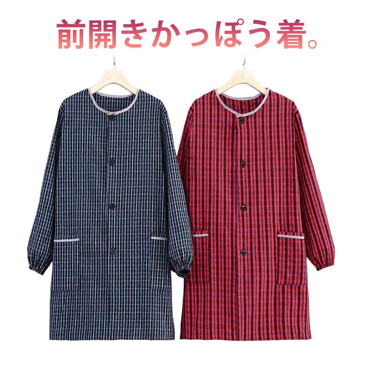 前開き 割烹着 百貨店 前あき 割ぽう着 小格子 スモック かっぽう着 かっぽうぎ 大人 まえあき 前ボタン 母の日 ギフト 長袖 エプロン 春 夏 送料無料