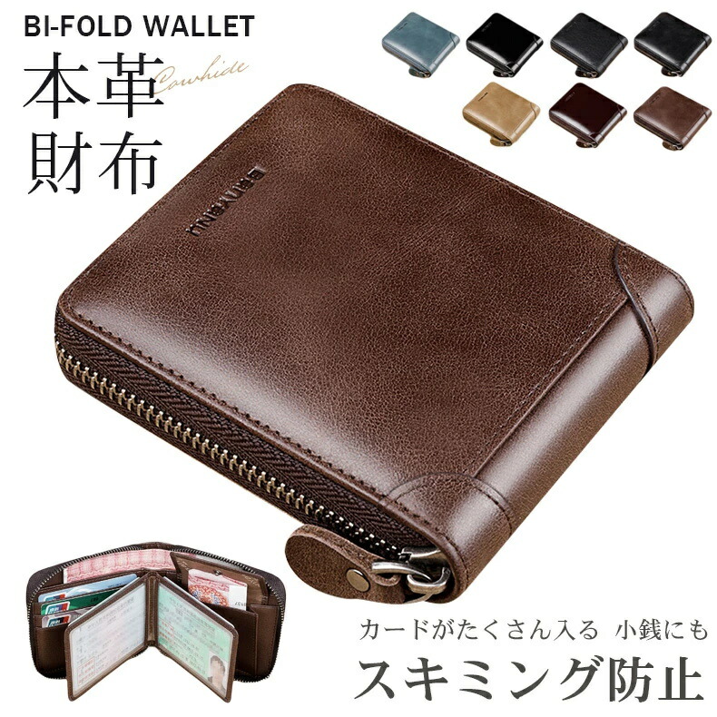 財布 メンズ 二つ折り カードがたくさん入る スキミング防止 コンパクト 小銭入れ付きカードケース 二つ折り財布 大容量 多機能 革 本革 牛革 ファスナー付き 男性 父 使いやすい